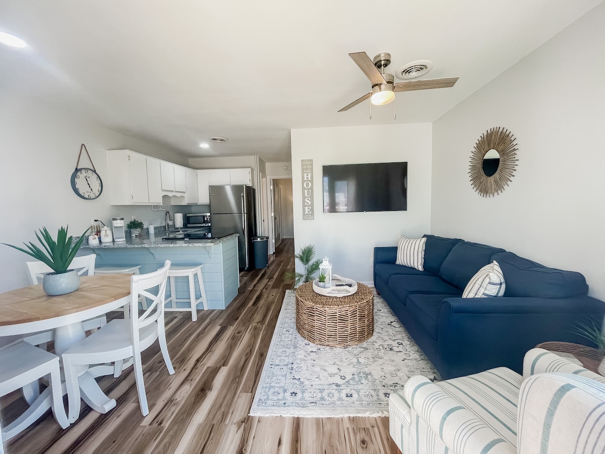Studioleilighet bare tre minutters gange til stranden og lyden! Profesjonelt innredet for å ønske deg velkommen til Topsail-livsstilen. Perfekt for et par eller en ferie for bare deg. Åpen stue med en uformell moderne sofa, med et komplett kjøkken med avanserte apparater. Bistro spiseplass for å nyte den lokale maten. Komfort i queensize-senger for søte drømmer! Vakkert bad med stor dusj og tilpasset vask. Ta med så mange klær du vil, skapet er fantastisk. Smart-TV med TRÅDLØST NETTVERK.