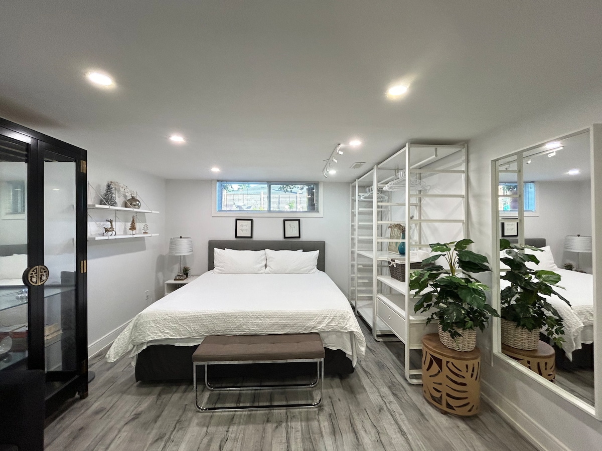 Slapp av i denne fredelige kjellerleiligheten. Du føler deg som hjemme så snart du går inn! Inkluderer en privat separat inngang til suiten, komplett med ett soverom med en komfortabel queensize-seng, et privat bad, fullt kjøkken med gratis kaffe, te og snacks, samt en stue med en sovesofa, TV og personlig kontorplass. En gratis parkeringsplass er også tilgjengelig. Dette sjarmerende stedet passer perfekt for forretningsreisende, internasjonale studenter, unge profesjonelle og par.