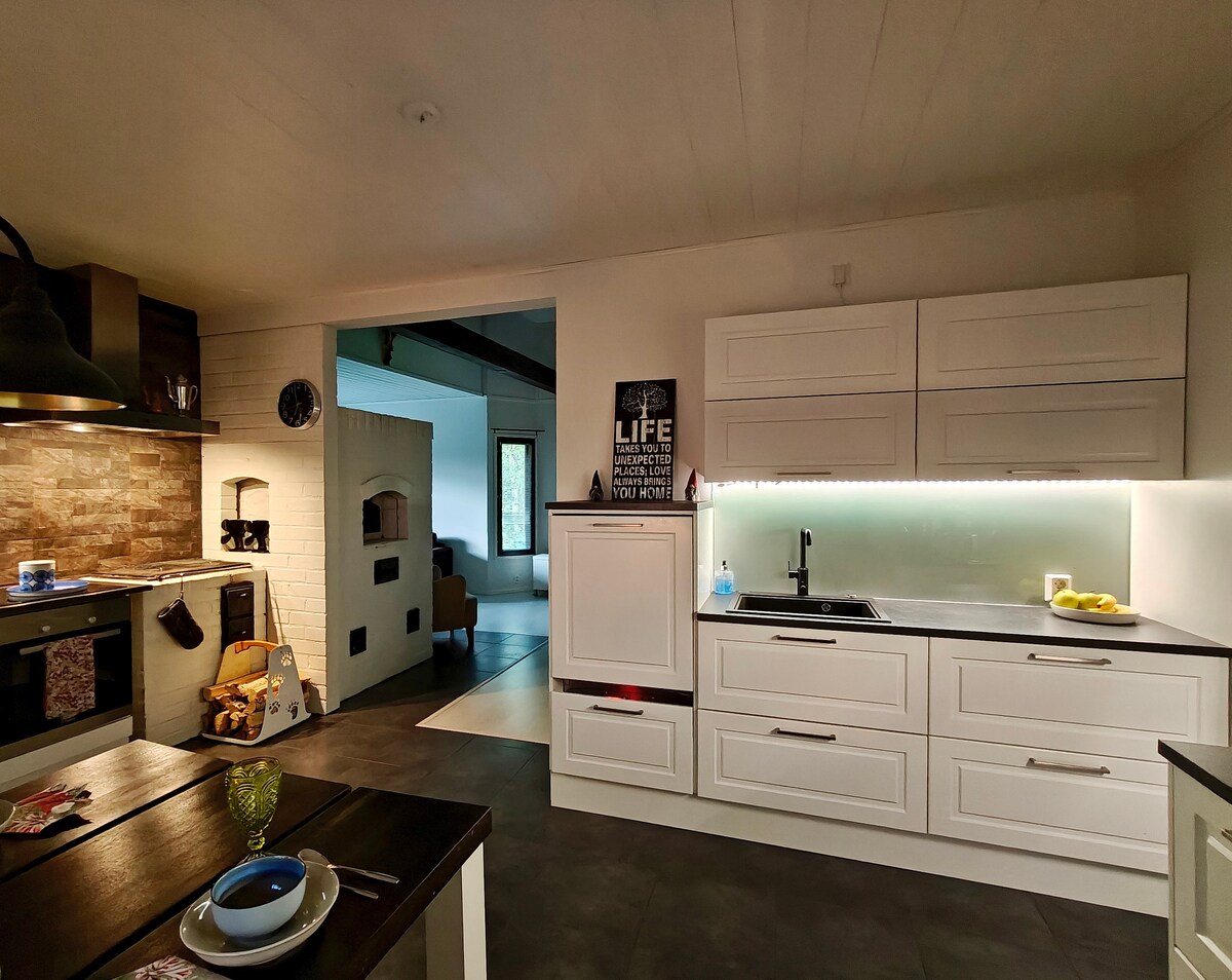 Et vakkert område bare 15 minutter med bil fra sentrum. Den koselige villaen vår (280 kvm) er et unikt sted å tilbringe en ferie i nærheten av byen, men likevel i svært fredelige omgivelser, omgitt av vill natur. Du kan sitte ved bålet. Når nordlyset vises på himmelen, er det enkelt å se det, fordi det ikke er noe kunstig lys annet enn lysene i villaen vår. (Mye bedre enn sentrum) Jeg tilbyr også et besøk fra en ekte julenisse i villaen min mot et lite tilleggsgebyr.