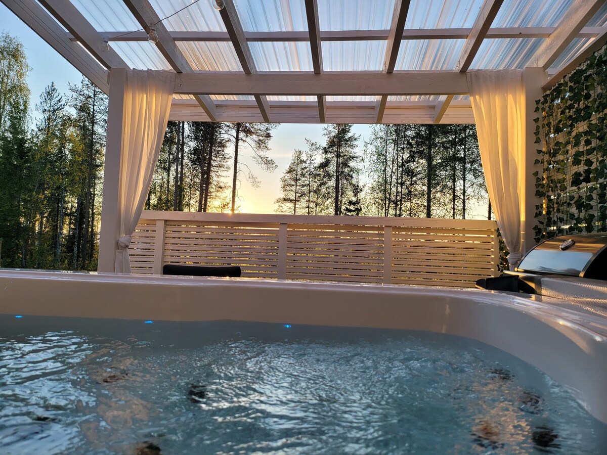 Velkommen til å nyte magi i Lappland i den moderne og koselige private villaen vår! Inkludert * 160 cm dobbeltseng. *140 cm sovesofa * Legg til to barnesenger på 140 cm (lengde) i kinorommet hvis nødvendig. *Privat utendørs boblebad *badstue. *Kinorom + Netflix. *Privat bakgård * Kjøkken inkl. servise for seks personer. *Privat parkering * Sengetøy, håndklær og rengjøring ved avreise er inkludert. Kom og oppdag hvordan luksus møter Lapplands ro i denne unike villaen! Hvis du har spørsmål, forteller vi deg gjerne mer!