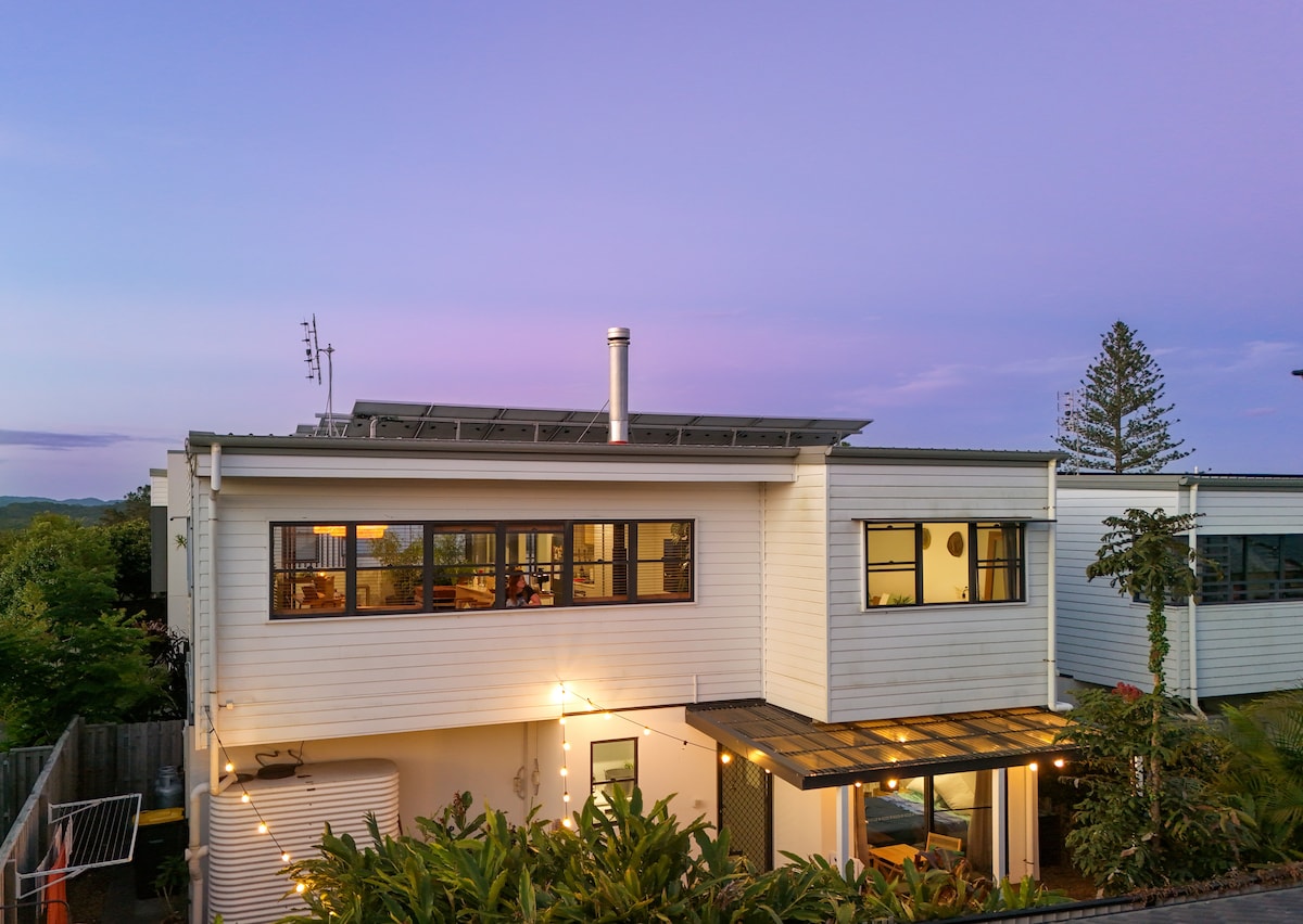 Breathtaking 270 degree distant views from sunrise to sunset. A newly built, self-contained eco villa, on a working cattle farm, providing stunning vistas of Byron Bay Hinterland from your bed! Natural lime-rendered hempcrete walls, rustic hardwood beams, & timber floors. Open plan with floor-to-ceiling glass. French doors in the bedroom open to the claw foot bath on the deck. Easy driving distance from Mullumbimby, Byron Bay, Brunswick Heads, Ballina airport and Coolangatta / Gold Coast.