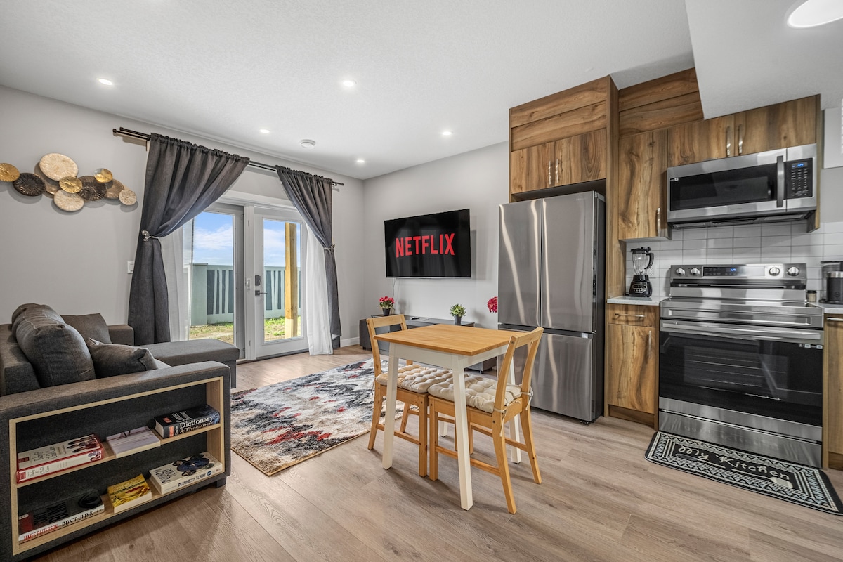 Modern and Cozy 2BR basement suite in Calgary, comfortably hosting up to 6 guests. Enjoy a private entrance, free parking, and a thoughtfully designed space for relaxing or working. Includes a well-equipped kitchenette, dedicated workspace with fast Wi-Fi, and a cozy electric fireplace. Just a 7-minute walk to the C-Train for easy city access, with Banff and the Rockies within a scenic drive. Perfect for families, business travelers, and mountain getaways. Licensed (BL256708).