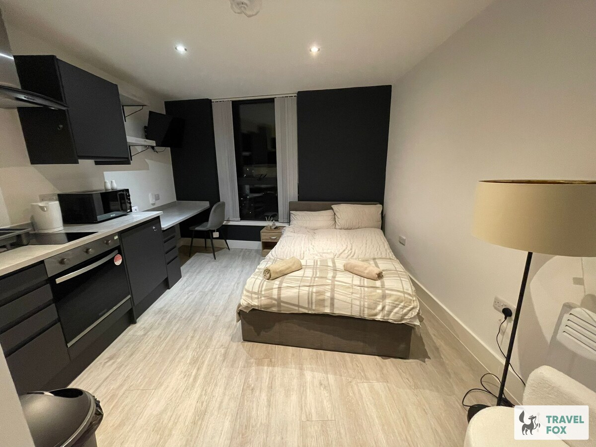 Nyt et stilig opphold i hjertet av Nottingham. Denne moderne studioleiligheten i sentrum har en lys åpen planløsning, moderne møbler, et komfortabelt soveområde og et fullt utstyrt tekjøkken. Studioet er ideelt for forretningsreisende, par eller gjester som reiser alene, og har raskt trådløst nettverk og smart-TV. Det er bare noen skritt fra butikker, restauranter, natteliv og transportforbindelser, og det er den perfekte basen for arbeid eller fritidsopphold.