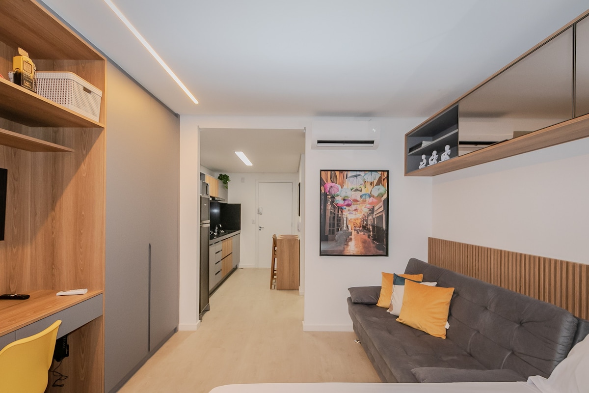 Moderne leilighet, 32 m2, beliggende på det beste stedet i Sion. Praktisk kjøkken med minibar, kokeplate, TV (åpne kanaler/Netflix), aircondition, hårføner, vannkoker og internett. Søndre sone, ved siden av Praça JK og Avenida Bandeirantes, foran et supermarked. Bygningens takterrasse med treningsstudio, badstue, svømmebasseng, fellesområde og felleskjøkken (vann, ismaskin). Rengjøring på forespørsel tilgjengelig. Sikker bygning med dørmann døgnet rundt. *Ingen garasje inkludert.