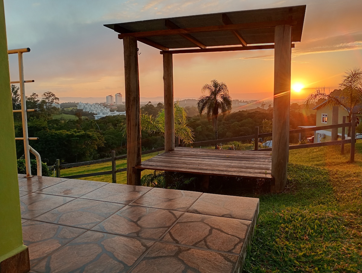 Relaxe neste espaço calmo e cheio de estilo. Seus PETS são bem vindos! Uma vista maravilhosa para a natureza. Há apenas 20 minutos do centro de Santa Maria. Ideal para 4 pessoas. Com 2 quartos. Possui sofá cama. Se for família, pode ser utilizado por 6 pessoas. Piscina com aquecimento! Churrasqueira, mesa de sinuca e até Karaoke para se divertir com a família (projetor, som e microfones) Apenas 5 minutos de estrada de chão (1,9km). Local seguro e tranquilo. Acorde com o barulho dos pássaros.