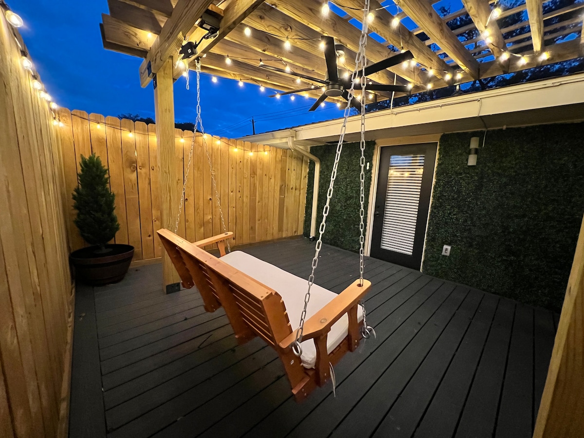 Slapp av i komfort og stil i dette spesialbygde 400 kvadratmeter store minihjemmet (nedre enhet). Med flott design og fasiliteter kan du nyte en Houston-ferie med kingsize-seng i lær og et kult bad. Fullt kjøkkenutstyr for dine kulinariske behov (ingen oppvaskmaskin), nyt stilig stue og vaskerom. Praktisk beliggenhet i nærheten av MedCenter, Galleria, NRG Stadium, Museum District, Upper Kirby, Rice Village, Montrose, River Oaks, Midtown/Downtown og Chinatown. Delt uteplass med sjarmerende hage. Enkel gratis gateparkering.