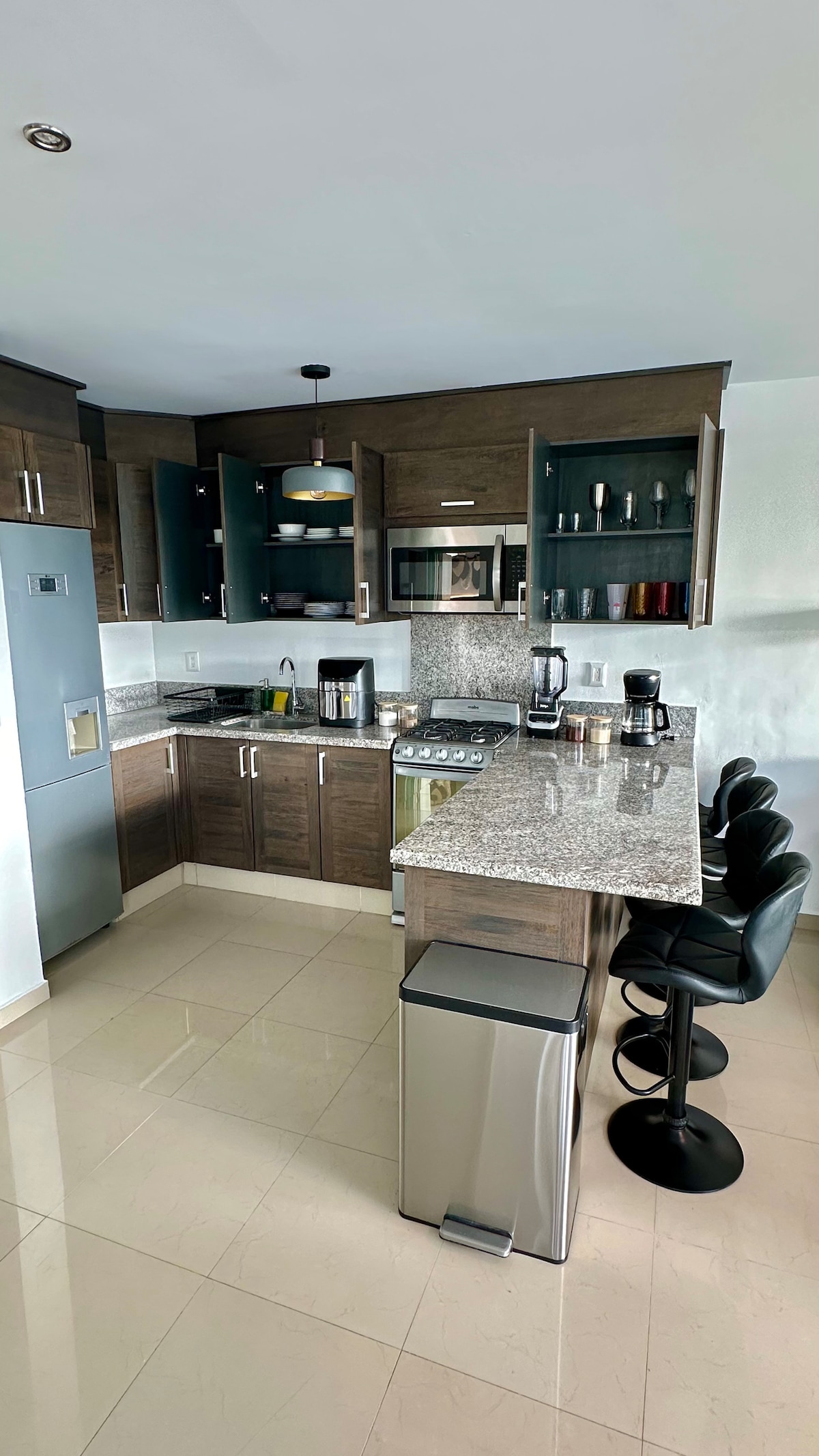 Fantastiske tre soverom, 3,5 bad. Leiligheten ligger i 8. etasje i leiligheten ved havet, sayan Beach, som har den beste takterrassen i alle puerto vallarta! Det er store hvite marmorgulv i hele leiligheten med surround bose-lyd, høyhastighets internett, fire TV-er, Dish Usa, Vitra og Restoratio Hardware-møbler, spektakulær utsikt over bukten og los muertos-stranden. Bygningen har tre bassenger i lobbyen pluss et uendelig basseng på taket, to jacuzzier, badstue, massasjerom og treningsstudio.