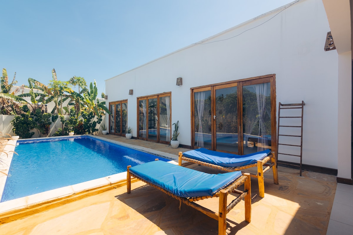 Maasai Villa, helt privat uten utsikt, ønsker seks gjester velkommen: et vakkert eksteriør Én generator, trådløst nettverk som kan ha strømbrudd på grunn av situasjonen på Zanzibar, gi et lokalt sikkerhetssjip, tre soverom med klimaanlegg, to bad, kjøkken, luftig stue, svømmebasseng, uteplass, rengjøring inkludert én gang i uken, mulighet for morgen-, lunsj- og kveldsmåltider på forespørsel, sikkerhet døgnet rundt, vaskeri. Turer med fortrinnspris med våre lokale partnere🌸