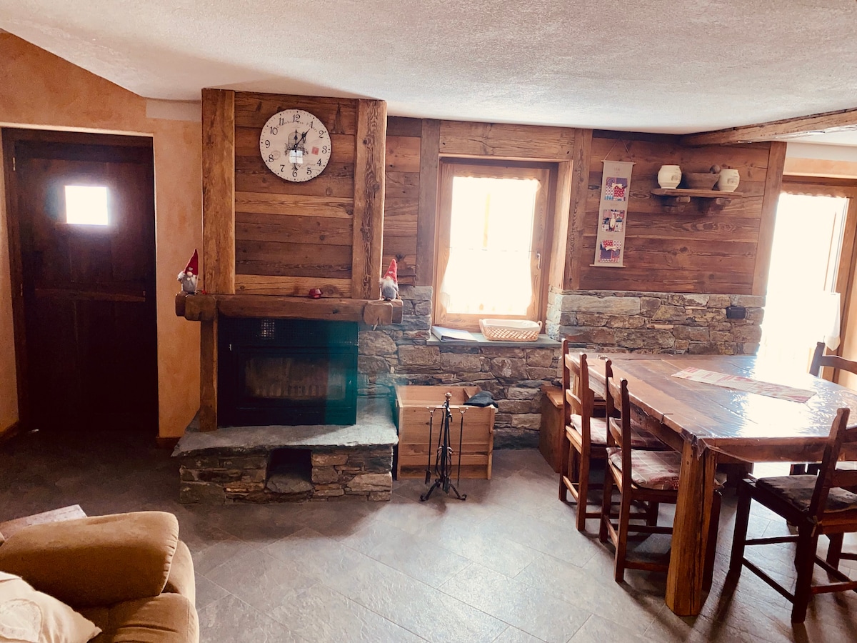 Alps Mountains. Italy. Aosta Valley. A cabin in a small village at 1600 meters,in the peace of meadows, grazing cows and mountains. Snow (usually) in the winter. A place of the heart, lovingly restored preserving the ancient beams of the roof. A wonderful view from the large windows and a special tranquility for those in search of peace, warmth and relaxation. The furniture is very nice: wood above all, but also more lively colors, and modern comforts. Quiet excursions, both on snowshoes or ski.