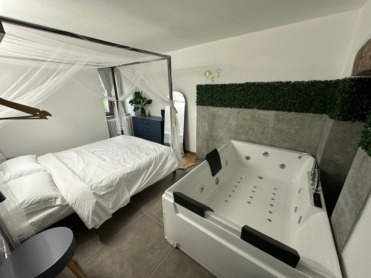 Penthouse Suite ligger i andre etasje og er fordelt på to etasjer. Nær Vi-inngangen og det første dobbeltsoverommet med romslig boblebad i tillegg til det private badet med dusj. Ovenpå finner vi stuen med en sovesofa og det utstyrte kjøkkenet, samt en terrasse med fantastisk utsikt over de vakre fjellene våre, et andre bad med dobbelt soverom. TV og trådløst nettverk i tillegg til alt du trenger for å lage mat. Leiligheten er utstyrt med sengetøy.
