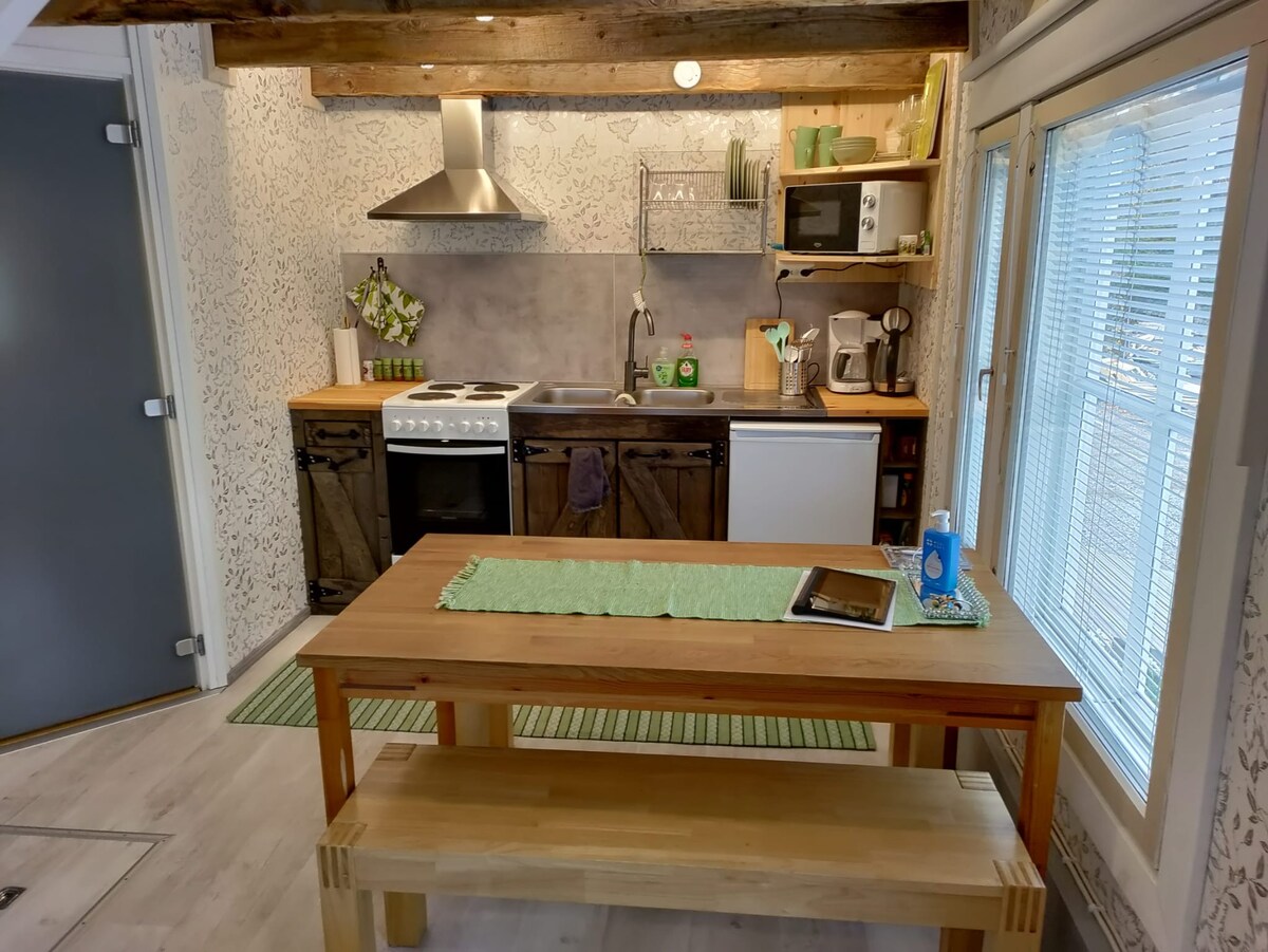 Welcome to our private cottage to enjoy your stay! Our small (37 m2) but comfortable cottage includes small kitchen with all amenities included (airfryer, no oven), big traditional finnish sauna, bathroom and tiny toilet. A/C (movable device, on request) makes your stay pleasant also in summer and the cottage is heated year around. For sleeping there is one queen bed (160 cm). Baby bed and one mattress 80x200cm available if needed. For safety reasons the hosts will warm up the sauna for you.