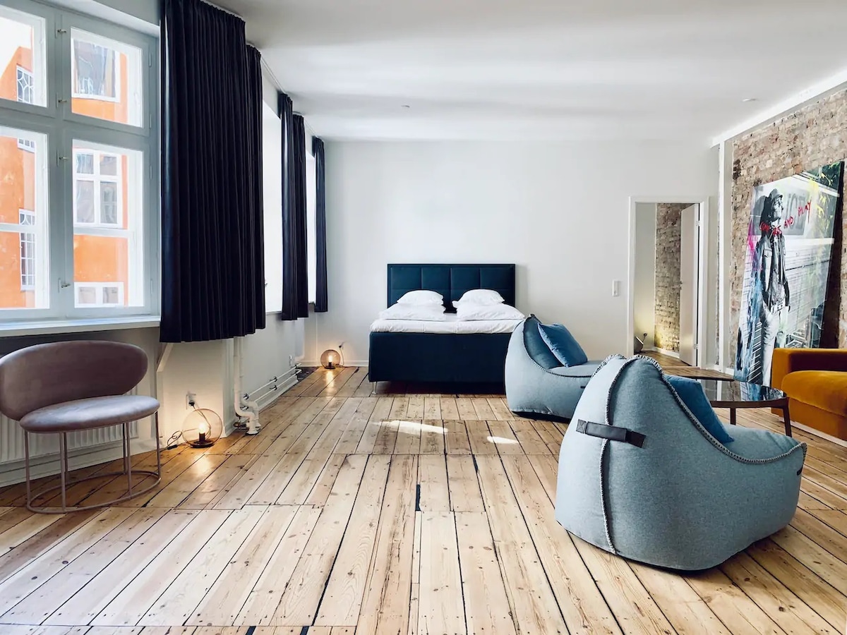 Unik og praktfull privat leilighet med en uslåelig beliggenhet i hjertet av Indre Københavns middelalderområde. Ditt eget «byhus» med egen inngang fra en rolig sidegate. En luksusleilighet i toppklasse på 140 kvm. Du bor i en luksusleilighet som er en fusjon av kunstgalleri. Designmøbler, håndlaget kjøkken, tregulv, høyt tak, samtidskunst. Historisk eiendom bygget i 1789, en gang et teater. Dette stedet er også perfekt for forretningsmøter/arbeidsopphold i lengre eller kortere perioder.