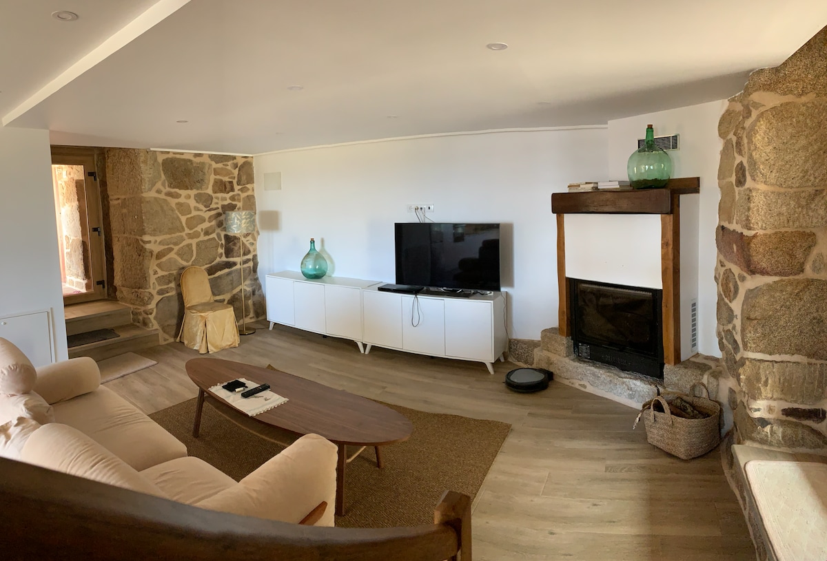 Casa de uso turistico muy fresquita en verano con una combinacion perfecta entre piedra y madera a 2 minutos de la hemosa playa de loira , la playa de Aguete y del real club nautico. En este alojamiento se respira tranquilidad: ¡relájate con toda la familia! y disfruta de la chimenea interior en invierno y de su calida estancia, dispone de un salon-comedor amplio aguardillado en madera para la mayor comodidad.