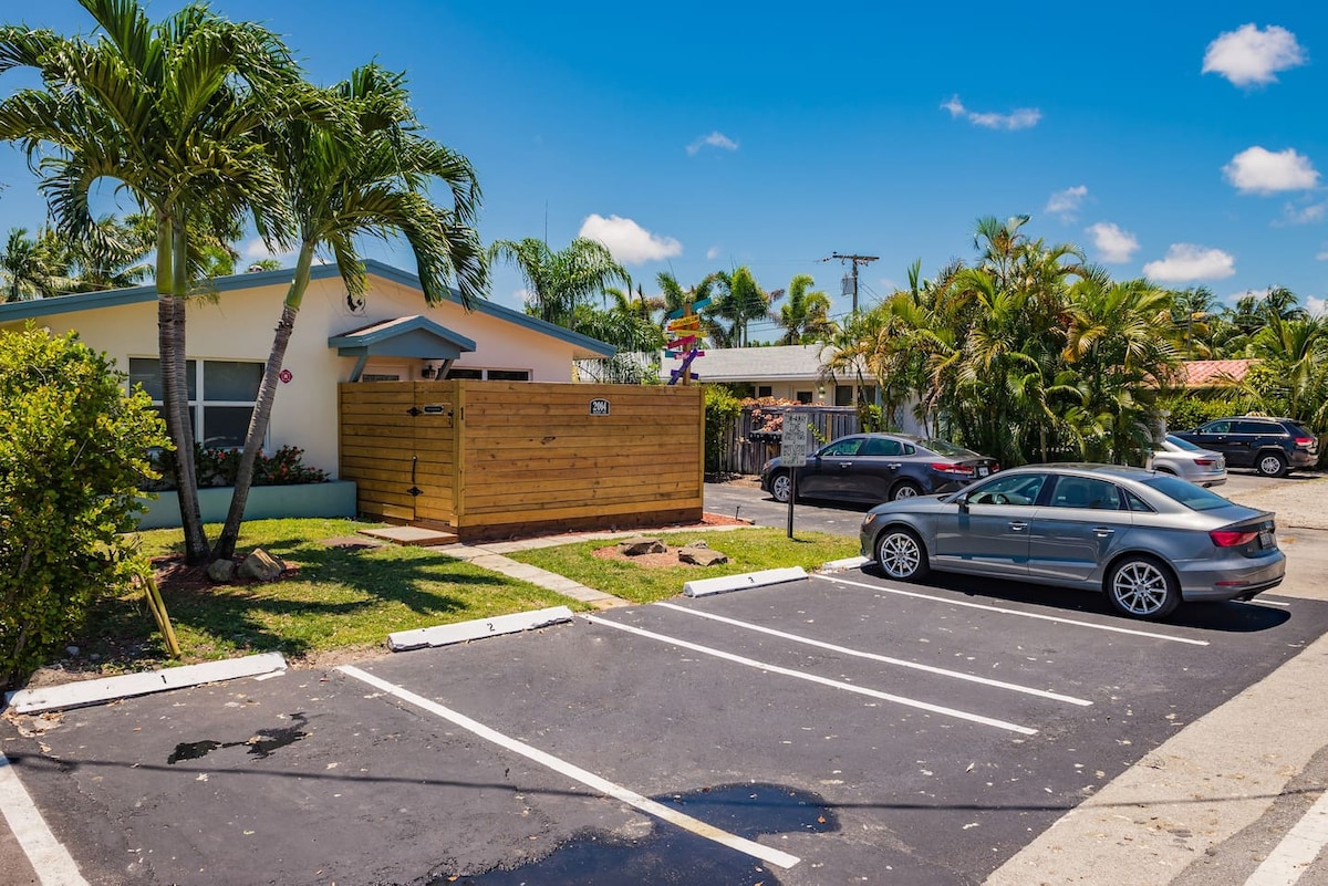 Romantisk, rent, privat og rolig: perfekt for å slappe av etter en dag på stranden eller på jobb. Moderne innredning, eksklusive apparater og møbler, 85" Samsung smart TV med Bose soundbar, privat veranda med grill. Bare 3 miles fra stranden og 1 mile fra hovedveien i95 og 1 mile fra Wilton Manors. Gangavstand til dagligvarebutikker, barer og restauranter.