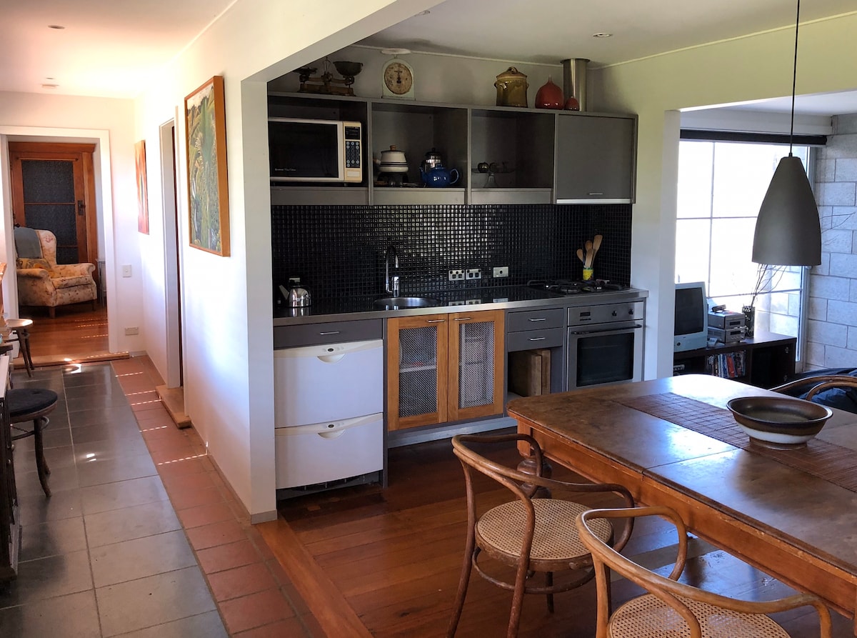 Privat liten leilighet som ligger i første etasje i hovedhuset. Alt for deg selv med en solfylt gårdsplass. Moderne kjøkken og bad. Komfortabel seng. Har også uttrekkbar dobbel sovesofa, og vi har en barneseng tilgjengelig. Ranch-skyvedør åpner til en fargerik blomster- og urtehage. Stille blindvei med reservasjon bare noen minutter unna. Parkering utenfor gaten. Netflix, strand/butikker/restauranter i gangavstand. Kaitake golfbane ligger like oppe i gaten. Butlers Bar and Cafe, et spesielt lite sted.
