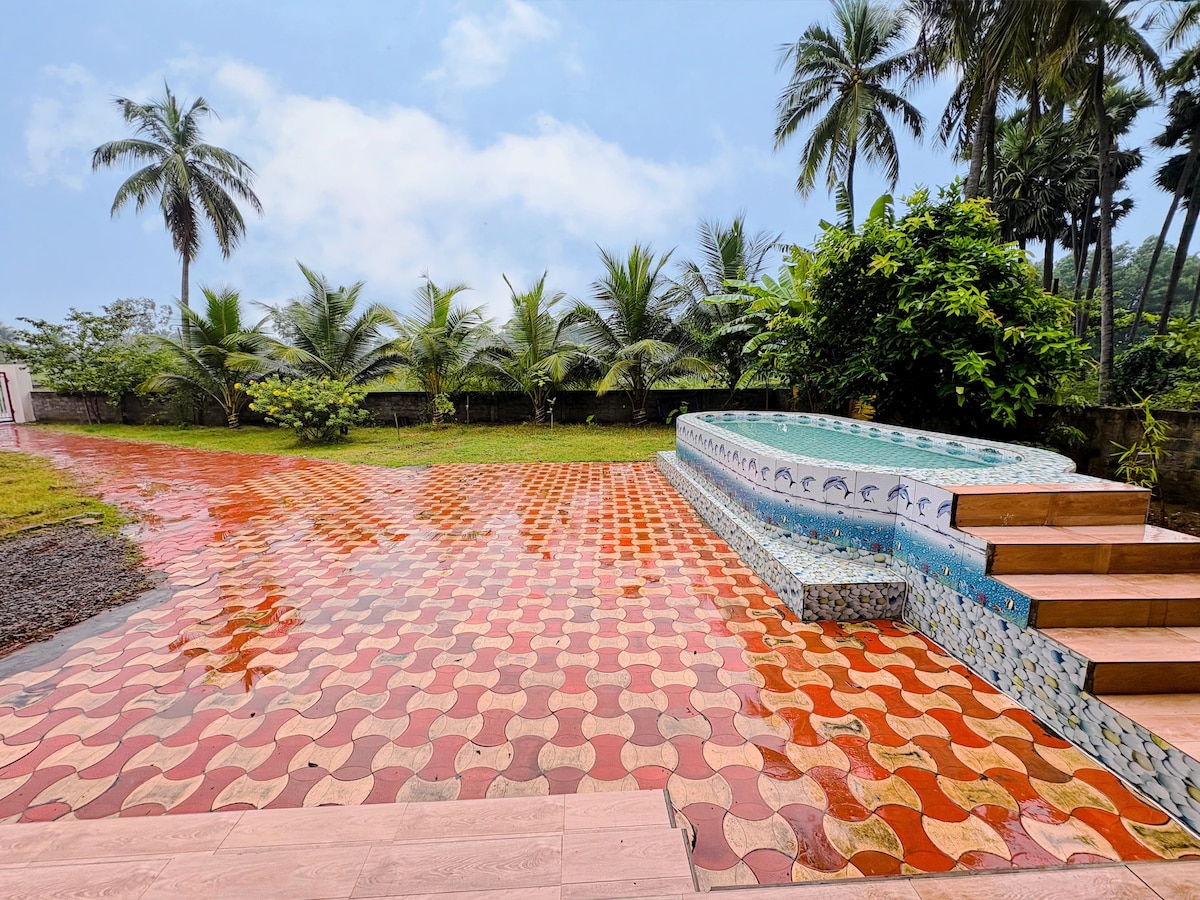 Sri Tulasi Eco Farm Stay er en vakker økologisk gård rundt 2 mål, og dette trehuset med friskt vann privat basseng med perfekt utsikt over elven gjør oppholdet ditt superminnert. Superkomfortabel luksus king size-seng, stor balkong og alle disse i fanget av naturen. Den ene siden har du utsikt over elven, den andre siden har utsikt over plenen. Når det gjelder aktiviteter, spiller badminton med barbeint, ta en dukkert i ferskvannsbassenget vårt eller bare bad i elven Saradha, nettcricket, fiske og hagearbeid.