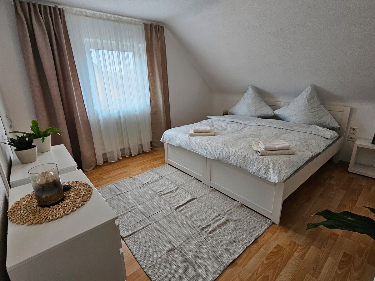 Entspann dich in dieser besonderen und ruhigen Unterkunft. Die DG-Wohnung im 2.OG bietet 2 Schlafzimmer 1 Wohn & Esszimmer, Küche und Bad. Das Haus ist ein Neubau und entsprechend ist die Innenausstattung in hellen und freundlichen Farben. Die Wohnung ist in einer ruhigen Lage und hat einen schönen Blick ins Grüne, auf dem es sich prima vom Alltag erholen lässt. Ausstattung: Fußbodenheizung, komplette EBK inkl. Geschirr usw. begehbare Dusche, bodentiefe Fenster im Wohn-Küche u.Essbereich.