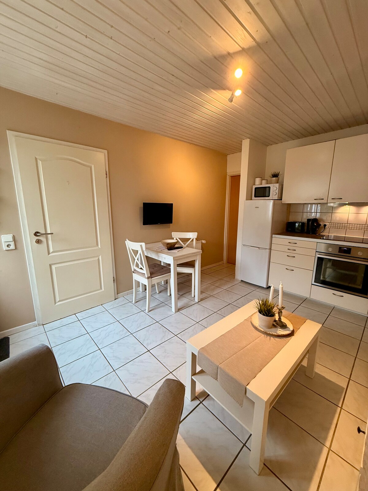 Dieses einfach ausgestattete, 20m2 große Apartment ist gut für eine Person geeignet. Das Tagesbett kann jedoch ausgezogen werden, so dass hier auch 2 Personen im Doppelbett schlafen können. Die Küchenzeile ist voll ausgestattet, so dass hier jede Art von Malzeiten zubereitet werden können. Ein geräumiges Badezimmer steht zu alleinigen Verfügung. Bettwäsche und Handtücher sind nicht im Mietpreis enthalten, können aber dazugebucht werden. Bettwäsche 5€ Hand-/Duschtuchpaket 5€