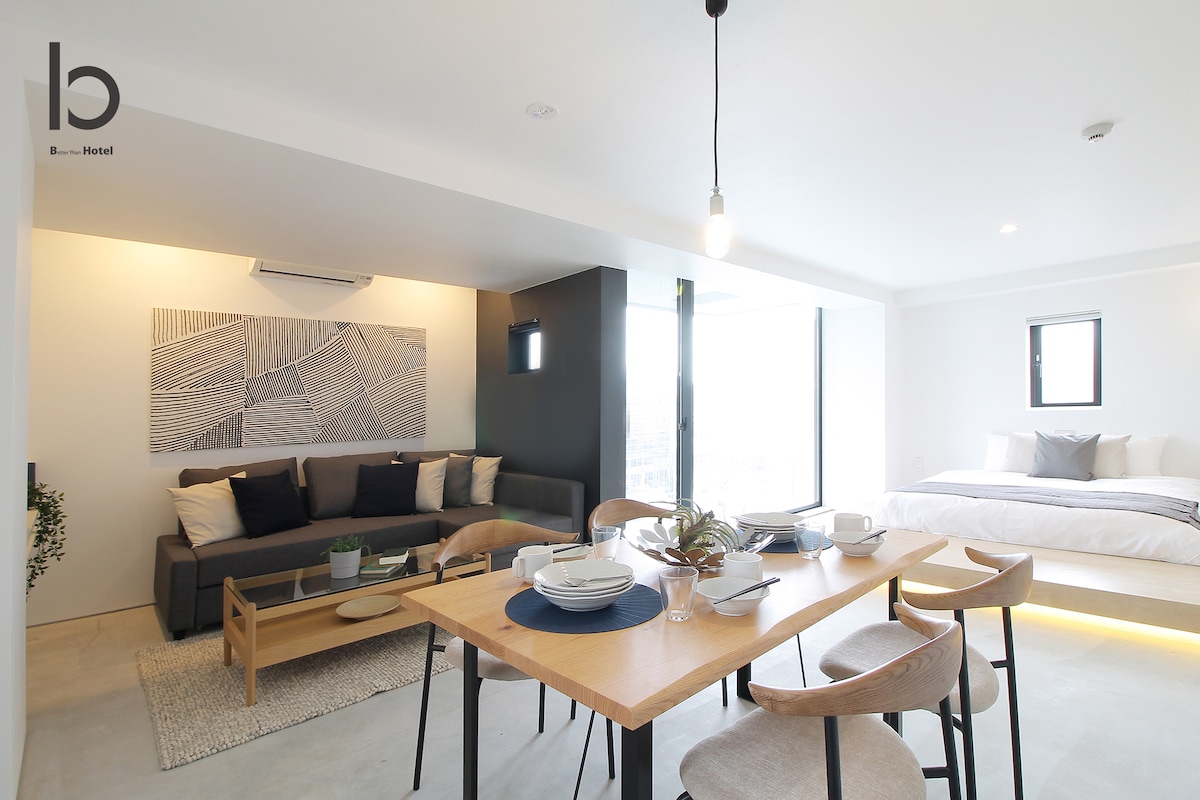 55 kvm moderne studioleilighet i sentrale Hiroshima. Passer for seks personer med balkong med utsikt over byen. Med heis og smartlåssystem for alle gjesters sikkerhet. Komplett med stue, spisestue og kjøkkenområde. Trådløst nettverk på rommet. Vaskemaskin med gratis vaskemiddel. Toalettartikler: sjampo, balsam, dusjsåpe, tannbørste og tannkrem. Separat toalett og bad. Omgitt av nærbutikker og restauranter. Det beste utgangspunktet for å utforske byen.