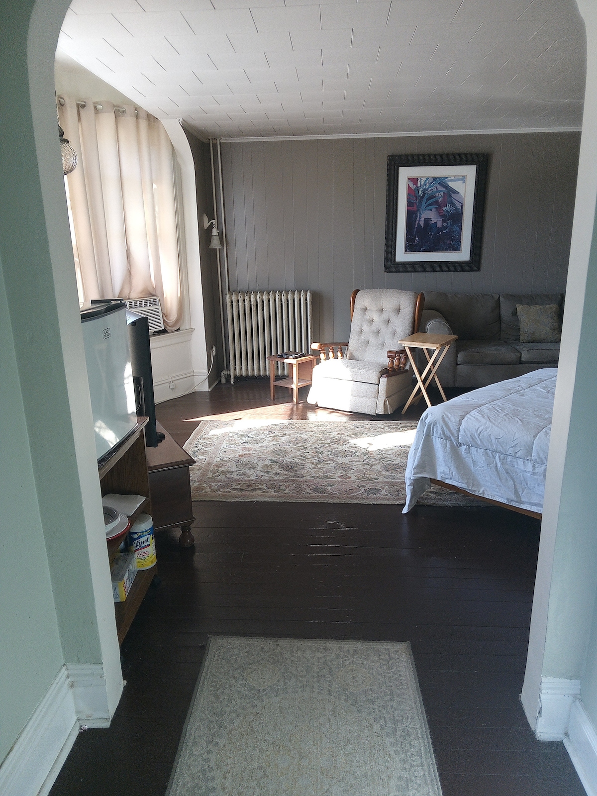 Du vil ikke forlate dette sjarmerende, unike stedet. Dette 125 år gamle viktorianske stedet føles som om du går tilbake i tid. Rom nummer to består av to områder, et arbeidsområde med et skrivebord og et soverom. Med dører til hvert område. Du deler bad med en annen gjest, hvis det området er utleid. Eller det ville vært ditt private bad hvis ikke. Badet viser også den opprinnelige alderen til dette hjemmet med det opprinnelige badekaret og gulvet. Helt i orden, du kan dusje også.