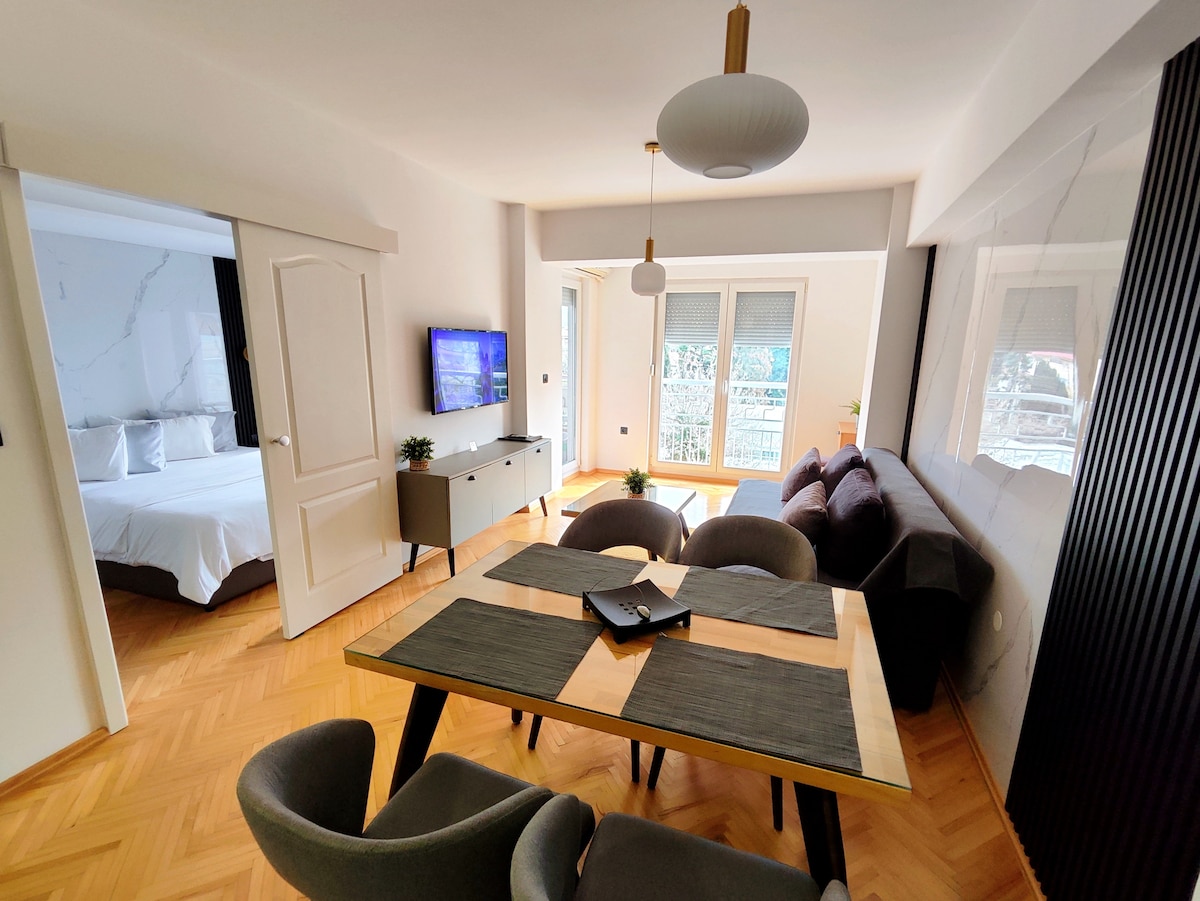 Velkommen til din rolige ferie ved innsjøen i hjertet av Ohrid i Nord-Makedonia. 🌿 Bare 50 meter fra den krystallklare bredden av Ohrid-sjøen blander denne gjennomtenkte leiligheten på 45 kvm komfort og ro i en distinkt Japandi-stil – hvor skandinavisk enkelhet møter japansk minimalisme.
