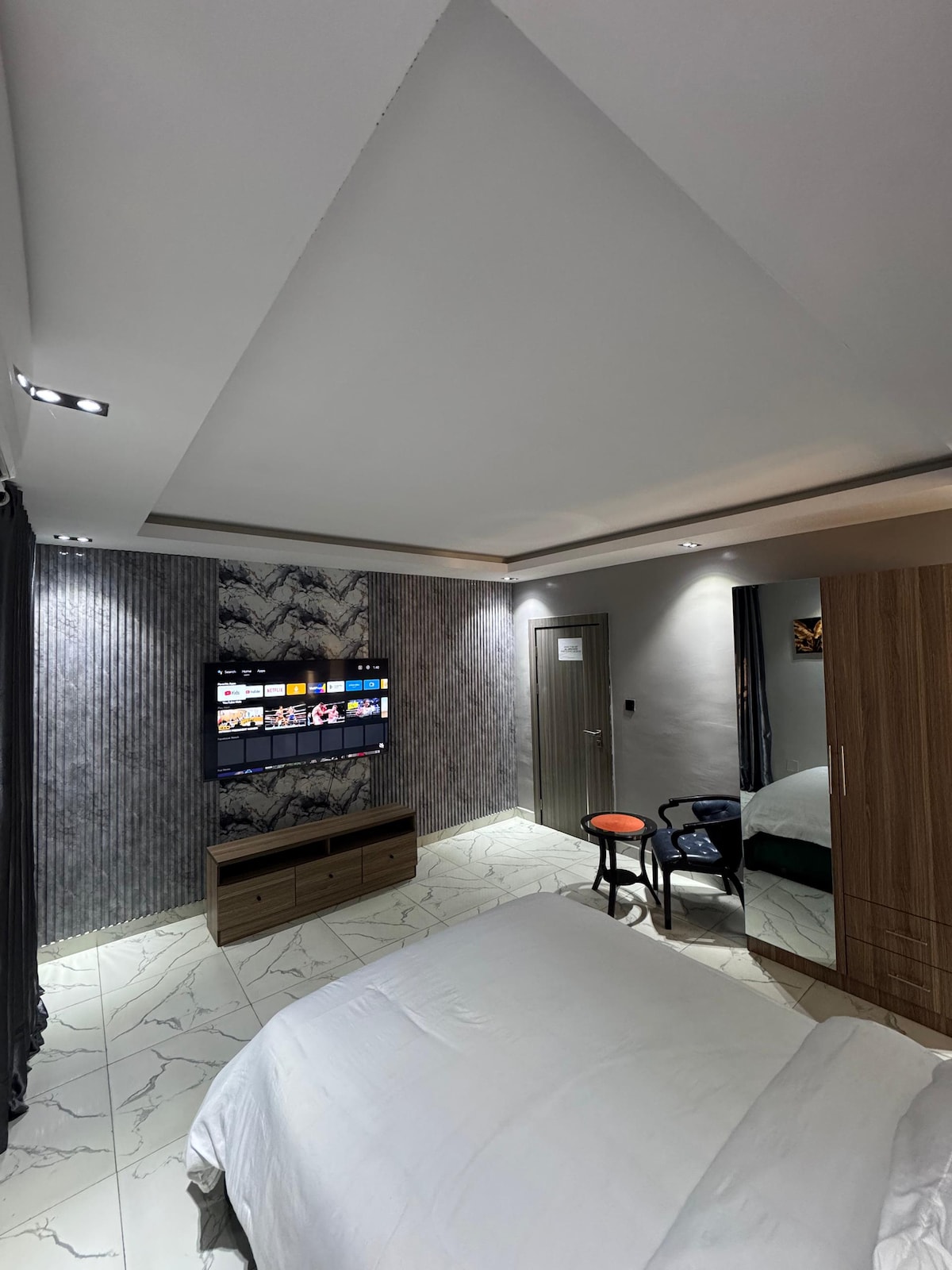 Standard ensuite room with semi orthopedic super king size comfortable mattress, modern bathroom with water heater. Unlimited fast WI-FI, 43inches Smart Tv in the bedroom and 55 inches Smart Tv in the sitting room, Netflix, YouTube, DSTV, Smoke alarm, 24/7 electricity with Band A supply frm the grid make my place unique wit no Blackout, Cctv, maximum security, 10min to International Airport and 5min to Domestic Airport. Sparkling clean, spacious and well organised Apartment for your comfort