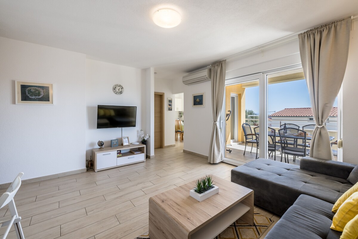 Nyt denne romslige og solfylte leiligheten (50 kvm) designet for å få deg til å føle deg som hjemme. Nærhet til stranden (60 m), en fantastisk og åpen utsikt over det vakre blå havet og himmelen, og alle nødvendige fasiliteter som leiligheten er utstyrt med, gjør at gjesten kan ha en ideell ferie fra den travle hverdagen. Nærheten til den vakre byen Trogir (4 km) og byen Split (30 km) er innenfor rekkevidde. Alt dette gjør dette stedet til et ideelt sted for en fin og avslappende ferie