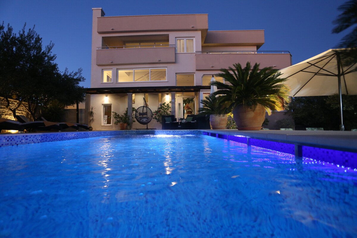 Sjarmerende moderne hus med det nye svømmebassenget – KLORFRITT :-) . Fin, nyoppusset leilighet i toppetasjen i huset med utmerket utsikt mot havet og øyene. Ved siden av den vakre terrassen er det et nybygd svømmebasseng. Leiligheten Maya 2 ligger tre kilometer fra det historiske sentrum i Trogir, og ti kilometer fra flyplassen. UNESCOs byer Split og Trogir ligger veldig nær huset, og nasjonalparken Krka ligger bare 30 km fra leiligheten.