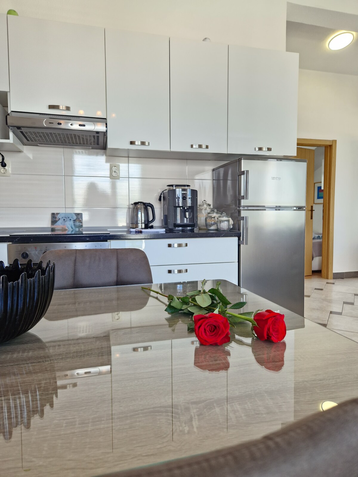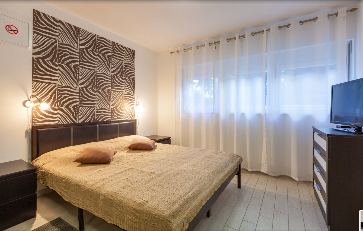 En fin leilighet med en stor solrik terrasse og fin utsikt utover sjøen. Eiendommen vår ligger på et veldig rolig sted og er egnet for familier med små barn. Sandstranden ligger 300 meter unna. Leiligheten har gratis parkering og en felles grill og basseng som er tilgjengelig for alle gjester i huset på en hel dag.
