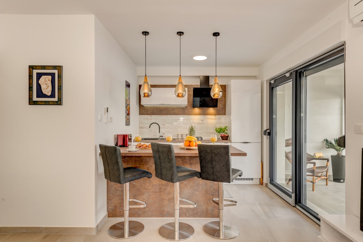 Slapp av på den romslige terrassen, nyt den fascinerende havutsikten eller ta en spasertur til øyas mest berømte strand. Leiligheten er stilig og full av naturlig lys, og har en terrasse på 30 m2 med utsikt over bukten. Den ligger bortgjemt i en rolig blindgate, bare noen minutter fra strandbarer, restauranter og kafeer. Fordyp deg i UNESCOs kulturarvsby Trogir, som ligger mindre enn 2 kilometer unna, eller reis til Split lufthavn på 15 minutter med bil. Den perfekte ferien venter!