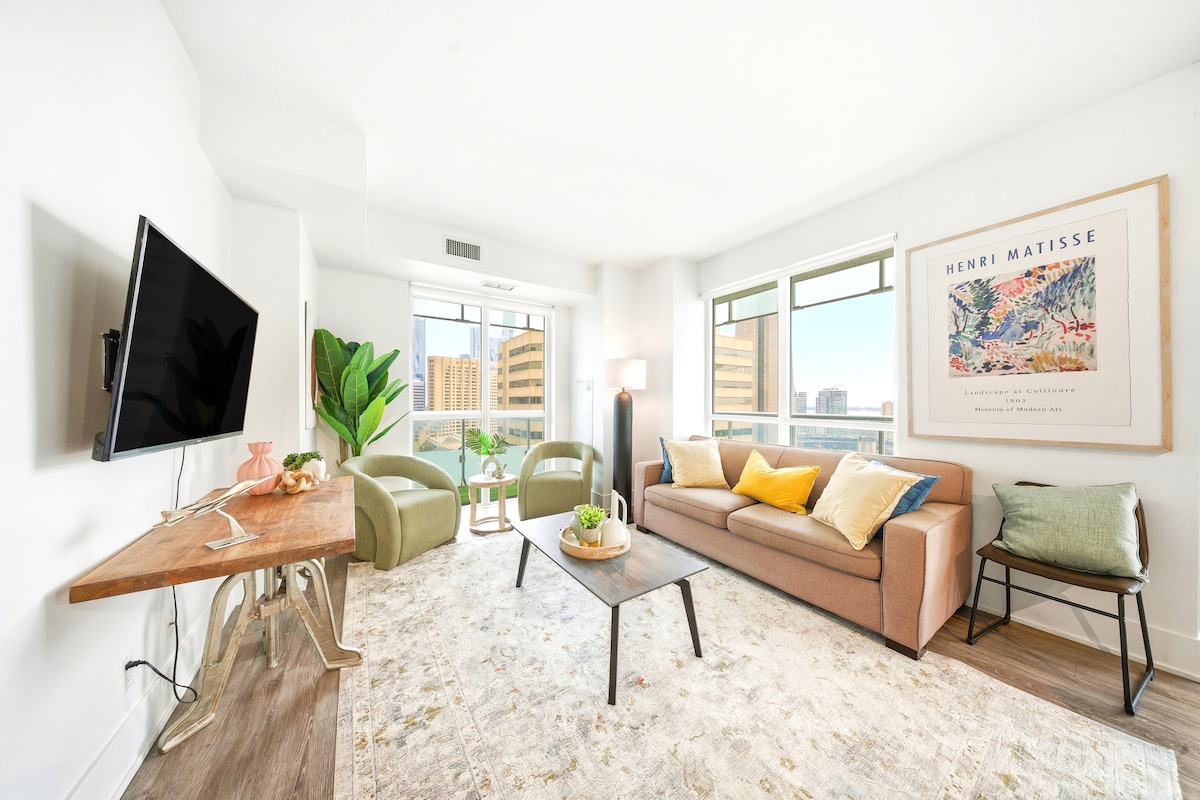 Stille, eksklusiv leilighet med to soverom i hjertet av Toronto sentrum med fantastisk utsikt over CN Tower. Perfekt for forretninger, arrangementer og langvarige opphold. Nyt direkte tilgang til Union Station, butikker, kaféer, LCBO, restauranter og Scotiabank Arena – perfekt om vinteren. Leiligheten har raskt trådløst nettverk, en 85 tommers TV, fullt utstyrt kjøkken, vaskeri i leiligheten, pluss fasiliteter i bygningen, inkludert basseng, badstue, jacuzzi og treningssenter.