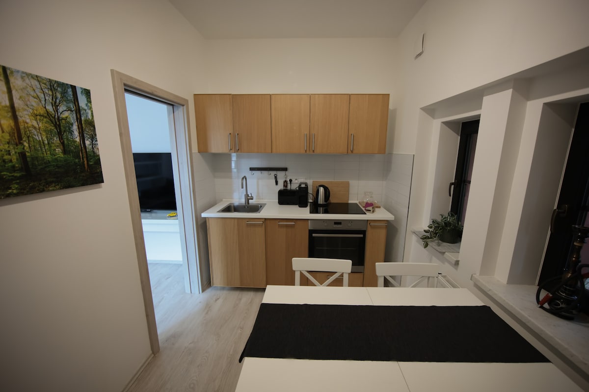 Liten moderne koselig leilighet med balkong og projektor med Netflix. Leiligheten ligger i et rolig nabolag omgitt av vakker natur. Leiligheten ligger ikke i sentrum, reisen til sentrum tar ca. 30 minutter, men transport er lett tilgjengelig (buss, tog, trikk). Takket være dette er området rundt leiligheten helt rolig og ideelt for turer i naturen, det er flere vakre naturlige steder innenfor rekkevidde av leiligheten. Det er en gratis privat parkeringsplass til leiligheten.