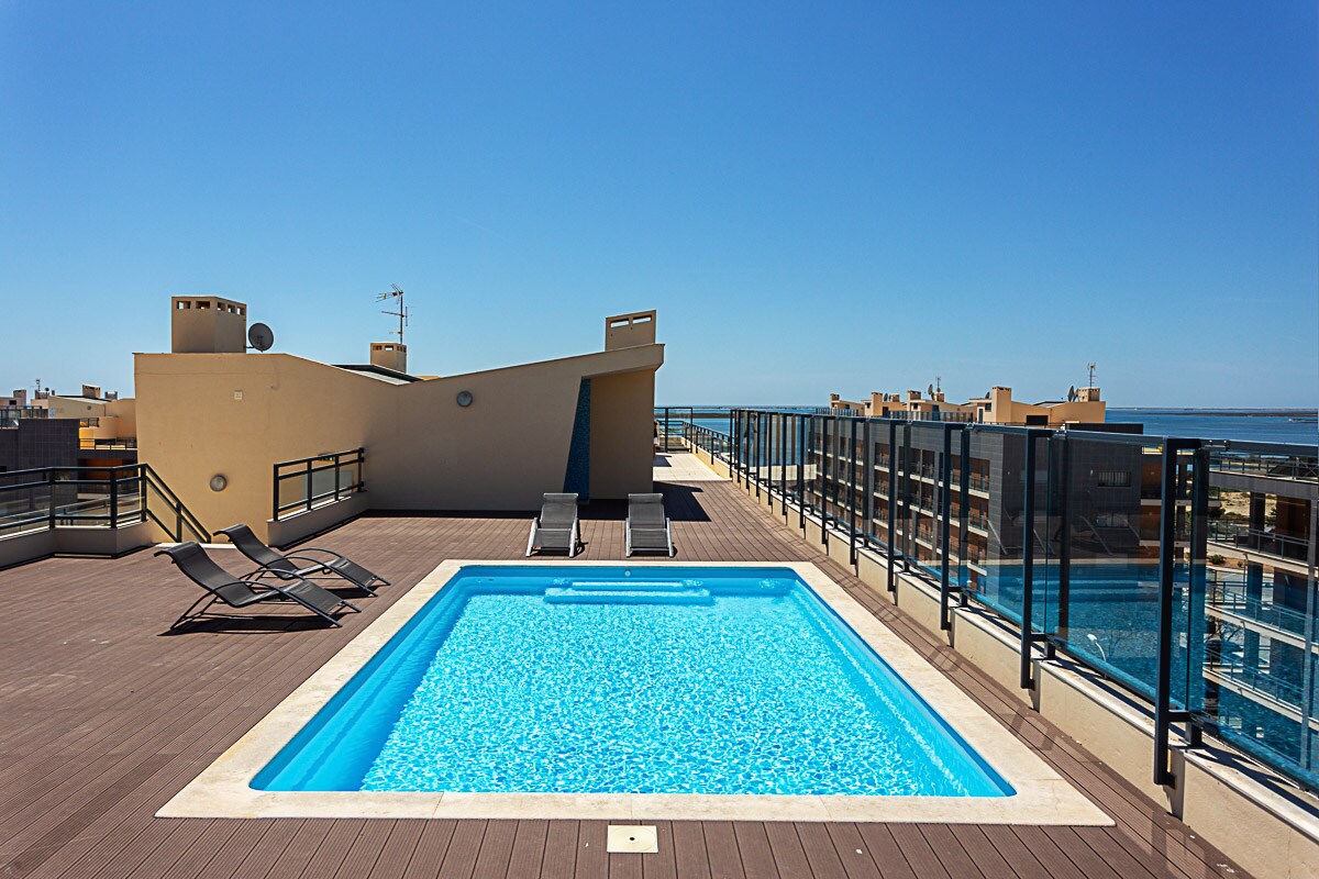 Ligger i et leilighetskompleks med en fantastisk utsikt over havet og elvemunningen, i utkanten av den gamle fiskerlandsbyen Olhão og marinaen. Denne luksusleiligheten har tre soverom og tre bad, og den har en perfekt beliggenhet for en avslappende ferie og for å utforske øyene, Algarve og mer. Store skyvedører åpner seg til et stort privat balkongbord og stoler for en fantastisk spiseopplevelse og et sted å sitte og nyte det varme klimaet i Algarve.