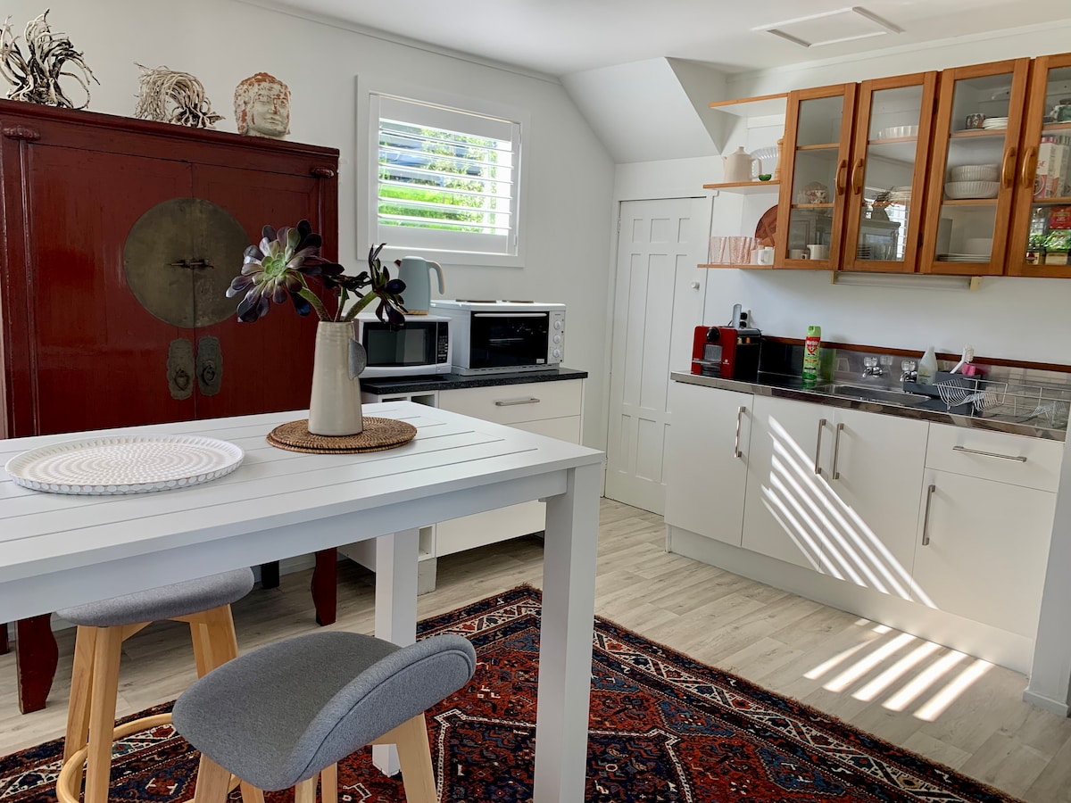 Bare Waiheke på sitt beste. Denne private, sentralt beliggende enheten er din ideelle Waiheke-base. Du vil føle deg som hjemme med en egen inngang, soverom, stue og moderne bad, sammen med et kompakt kjøkken for grunnleggende matlagingsbehov. Din egen private terrasse har utsikt over en fredelig, naturlig hage med grill og utemøbler, slik at du kan nyte stedet. Du trenger ikke en bil med bussholdeplasser rett utenfor – Little O-stranden ligger tre minutter, 210 meter, fra døren, og Oneroa-landsbyen ligger åtte minutter unna.