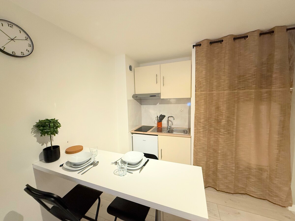 Nyt et nytt, elegant og ideelt plassert hjem. Denne renoverte T2 består av et soverom, en stue/spisestue, kjøkken og bad med toalett. Beliggende 15 minutter å gå fra katedralen, 5 minutter fra stadion, kan du nyte alle fasiliteter. Arbeider eller ferierende, du har en privat inngang og gratis parkering. På forespørsel: - Mulighet for å parkere motorsykkel i en lukket garasje. - Oppsett og klargjøring av en ekstra seng (hvis 2 separate senger).