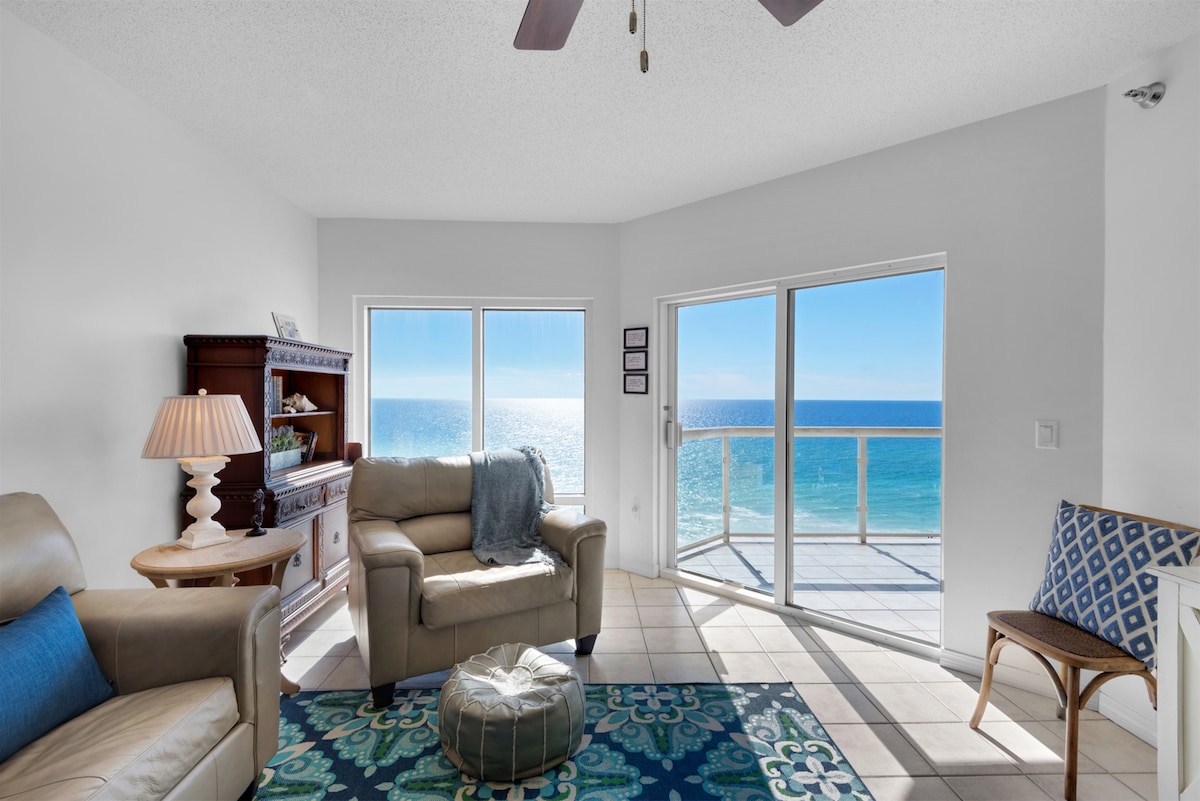 SPØR om RABATT for lengre opphold i januar og februar 2026. IKKE KJEMP MOT FOLKEMENGDENE for plass på stranden! Slapp av i vår komfortable fjerde etasje "Slice of Paradise" med privat strand. Balkongen tilbyr uhindret, nydelig utsikt over bukten og den vakre hvite sanden i Perdido Key. Nyt solen mens du lener deg tilbake på balkongen og teller delfinene mens du blir lullet av lyden av bølgene og den salte luftbrisen. Nylig OPPDATERT – nye bilder kommer snart!