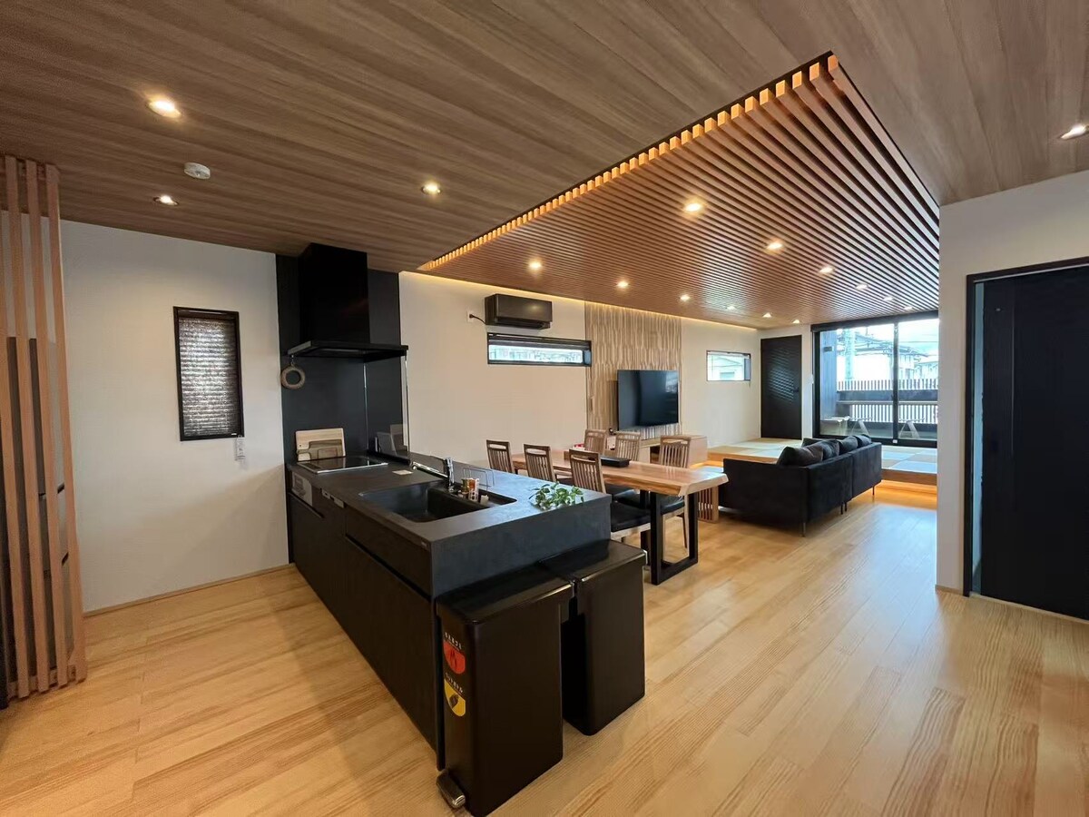 Ume no Yu Gekko ligger 4 minutter til fots fra Dazaifu stasjon, og det er en praktisk nærbutikk og et supermarked innenfor 1-2 minutters gange, og det er også restauranter i nærheten, så vi lover deg et komfortabelt opphold. Et moderne japansk hus med luksuriøs privat utleie, og kan huse opptil 11 personer. Det er gratis parkering for 2 biler, så du kan bruke det som en base for en Kyushu-tur. Hovedsoverommet er utstyrt med en projektor med elektrisk skjerm, og vi har en kontrakt med U-NEXT, slik at du kan se dine favorittfilmer og dramaer på storskjerm. I tillegg er det plassert stoler og bord på balkongen, slik at du kan nyte måltider og drikke i en stilig atmosfære. Stor stue og spisestue, komplett med et trebord med plass til opptil 8 personer, og en L-formet sofa av høy kvalitet som brukes på hoteller, gir en komfortabel sitteplass. Når det gjelder utstyr, er det fullt utstyrt med vaskemaskin og tørketrommel, så du trenger ikke å bekymre deg for å vaske klærne dine selv om du blir her i flere netter eller over lengre perioder. For å gjøre oppholdet ditt behagelig, er det en Nespresso kaffemaskin tilgjengelig, slik at du kan lindre reisetrygget med en kopp kaffe. Vi har lagt til et kart over restauranter i nærheten i guideboken, så vennligst bruk det som en referanse for måltider.