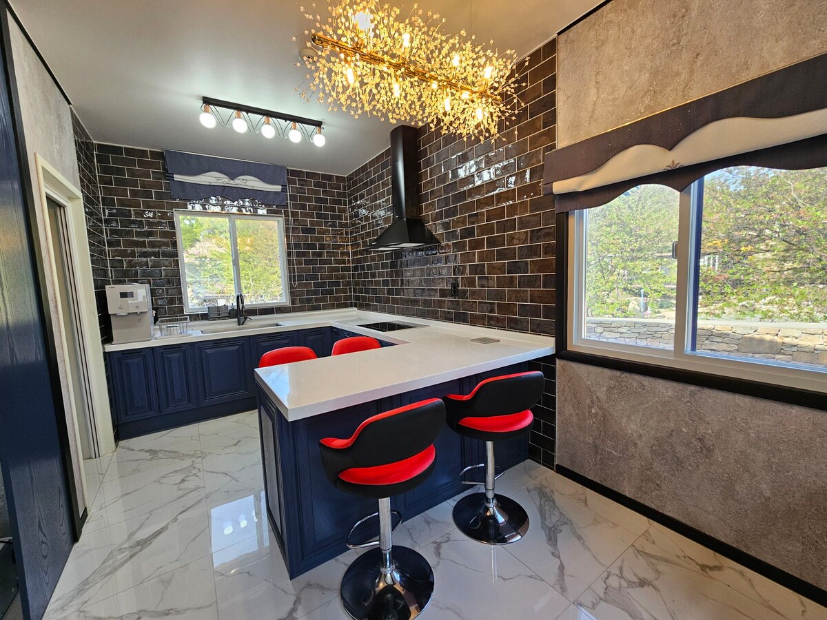 I det insta-inspirerte interiørhuset Nyt grillen og peisen. Det er et skogsopphold med et moderne og enkelt hvitt interiør som understreker raffinement og praktiskhet. I tillegg er det et spesielt sted med et stort rom med 2Bathroom & 3Room & 4QueenBed, og en grillrom som kobles til spising. (Det er en grense for åpningen av rommet og badet avhengig av antall personer, så sørg for å sjekke på forhånd i detaljene). - Absolutt forbudt å gå inn på utsiden av det planlagte antallet personer. Placebo-situasjonen overvåkes til enhver tid av CCTV ved inngangen til hver etasje. Maks antall gjester er 10, voksne eller barn. Åtte tenåringer + to spedbarn under 24 måneder (Inkludert andre besøkende gjester enn 2 personer, 20 000 KRW ekstra per person, gratis inngang til spedbarn) - Grillplassen og peisen innendørs kan brennes. (Ekstra kostnad: 30 000 won for grill/20 000 won for bålplass) - Fullt utstyrt med kald- og varmtvannsrenser, ismaskin, Nespresso-maskin, induksjonskoketopp, betalt vasketårn, ulike matlagingskrydder osv. - vask tårn for klesvask (betalt) Vask + tørking: 10 000 KRW per last Gratis tjeneste: én gang for tre påfølgende netter