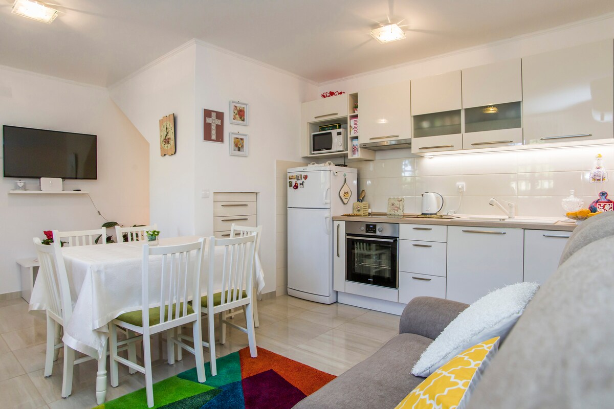 Vakker nyrenovert leilighet i gammelt dalmatisk hus. Perfekt for familier på fire. Det er et soverom med dobbeltseng og uttrekkssofa i en stue for ytterligere to personer. Kjøkkenet er utstyrt med det grunnleggende! Fra terrassen har du vakker havutsikt og utsikt over landsbyen. Det er lett å finne parkering foran huset. Det er ikke privat, men det er gratis og nøyaktig foran huset.