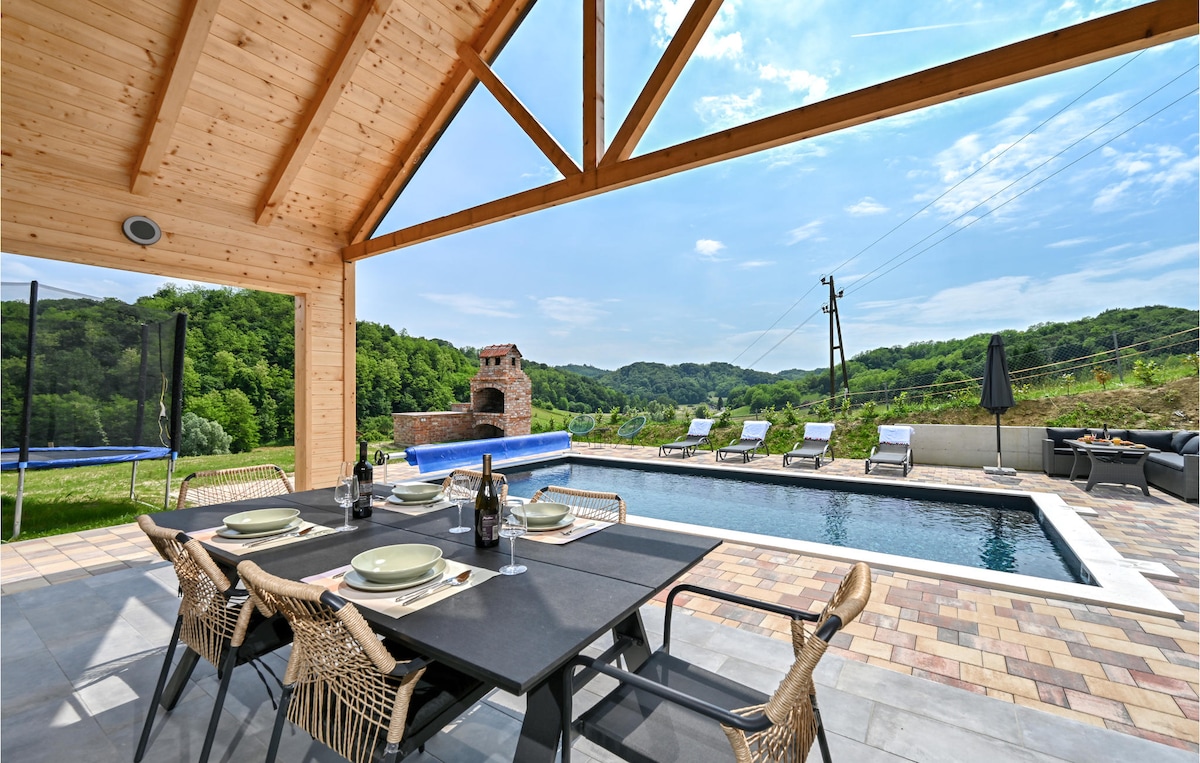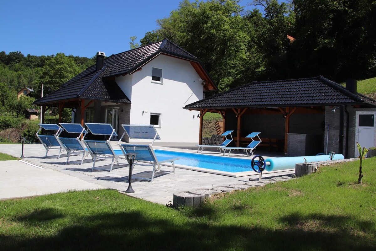 Feriehus med privat boblebad i Zagorje i Kroatia, perfekt for par, familier eller venner. Huset har tre soverom, tre bad, et fullt utstyrt kjøkken og en koselig stue med peis. Nyt en overbygd terrasse, grill og en ny lekeplass omgitt av en rolig utsikt over landskapet. I nærheten av det termiske spaet Terme Tuhelj. Plass til seks + to gjester på sovesofa (på forespørsel).