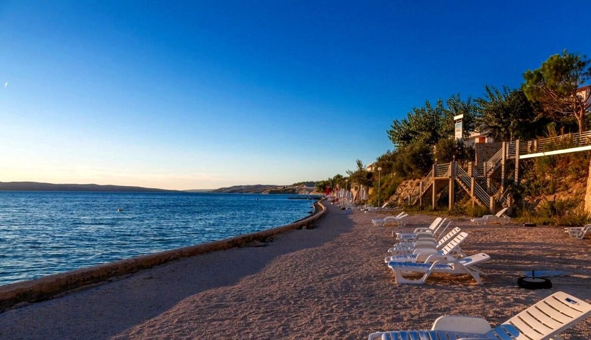 **New stone apartment near the sea with fantastic sea view**. Apartment 55m2 for 2 + 1guests . Spacious living room with sofa that becomes a double bed (smart TV, air conditioning)Kitchen (oven, dishwasher, coffee machine). 1. Bedroom (large double bed, wide wardrobe) with toilet (shower). The apartment has a private terrace (10m2) with amazing sea views. The terrace contains a table for 4 people.