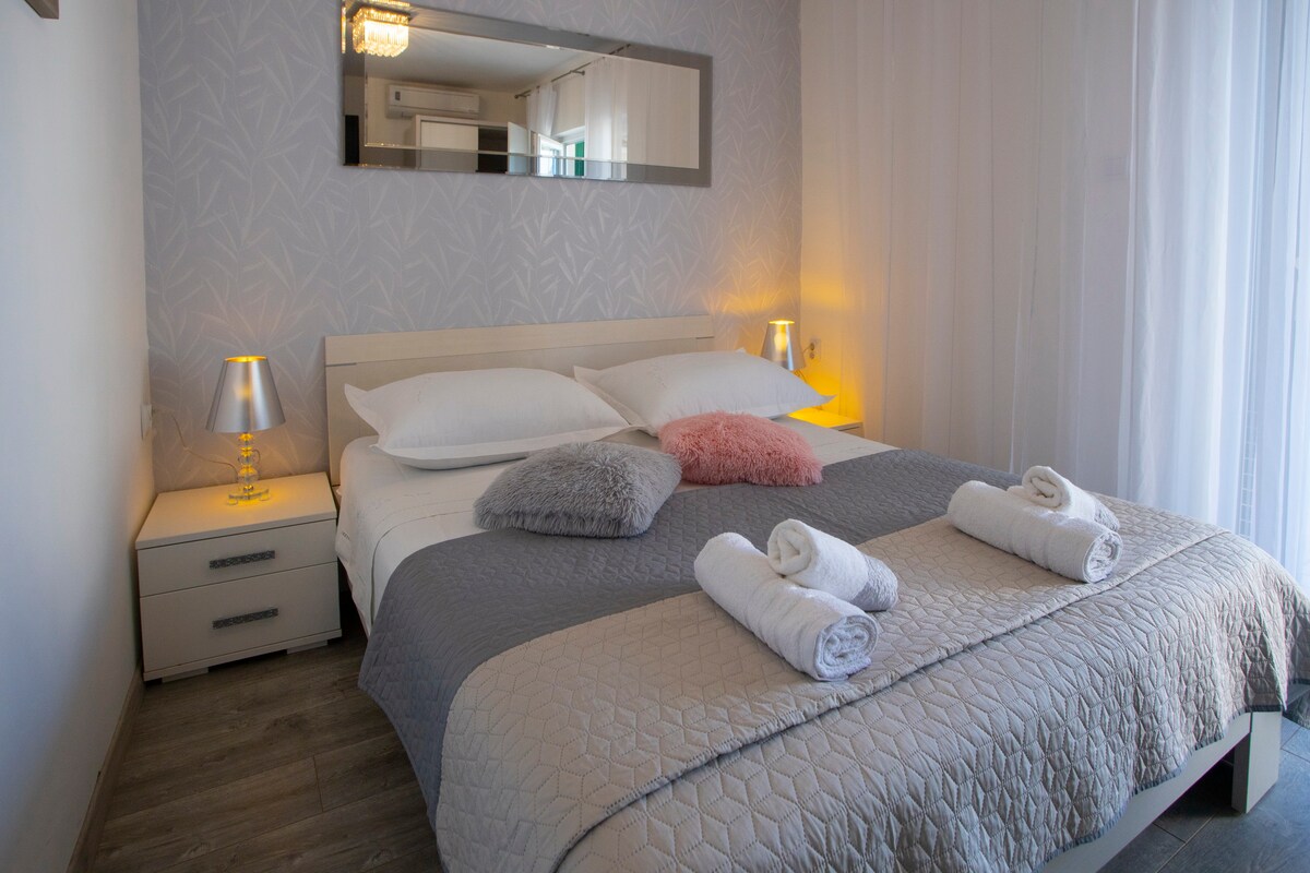 Velkommen til den nye leiligheten vår, ideell for ferien din! Den består av to soverom, stue, kjøkken med spisestue, bad og separat toalett. Den ligger i en nybygd utvikling, bare noen minutter fra en vakker strand. Nyt en stor terrasse med fantastisk sjøutsikt. Suiten er fullt møblert med moderne møbler og mange ekstrautstyr, perfekt for en familie på opptil fem personer. Bestill ditt opphold i dag!
