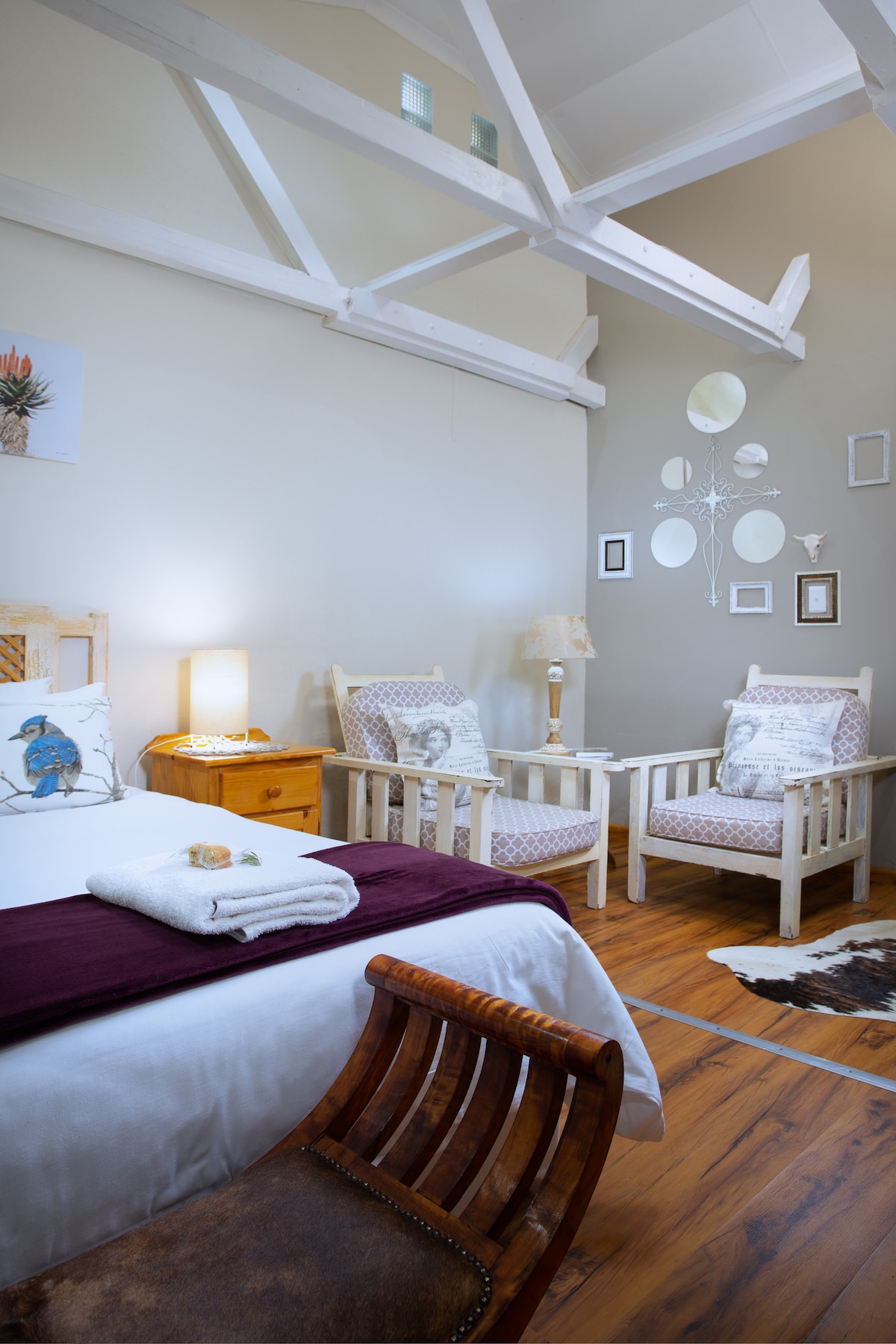 Dette unike stedet har sin helt egen stil. Leilighet med ett soverom og eget bad, som er knyttet til et hovedhus med selvbetjeningsfasiliteter. Stuen varmes opp av en vedfyrt peis, og soverommet har eget bad og klimaanlegg. Braai-fasiliteter på stedet samt en smart-TV med DSTV og trådløst nettverk. To til tre km fra sentrum, på en fjellside. Det er nederste nivået i et treetasjes hus, men helt privat og ikke påvirket av strømbrudd.