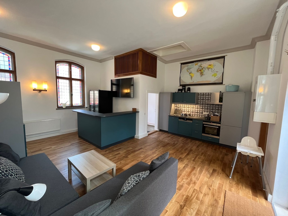 Loftsleilighet 20 minutter med bil fra Potsdam og Berlin og 30 minutter med tog fra BER. Romslig, fullt utstyrt designkjøkken*, bad med Agape Vieques badekar og matchende vask*, soverom med 2,70 m stor seng*, treningsrom kan brukes som et ekstra soveområde. Her er en 1,80 m dobbeltseng*Projektor med forhåndsinstallert app for NETFLIX, Disney + og Amazon Prime Login, leker, supermarked med baker og slakter, drikkevaremarked*Badesjøer og fotturer
