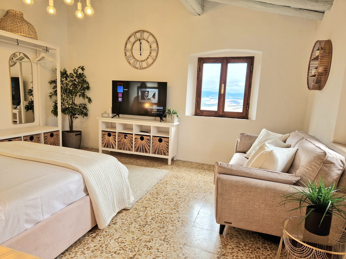 Slapp av og slapp av i dette rolige, stilige stedet. Nyrenovert hele veien. Beliggende rett på hovedtorget med utsikt bakover mot det nydelige Valdera-landskapet. Soverommet har blitt innredet med komfort i tankene, madrass og puter i minnesskum, sengetøy og håndklær i bomull, samt air-con og storskjerm smart-TV. Kjøkkenet har stekeovn, elektrisk platetopp, oppvaskmaskin og vaskemaskin, kaffemaskin, kaffemaskin, brødrister og vannkoker. Det moderne badet har en romslig dusj, vask og toalett.