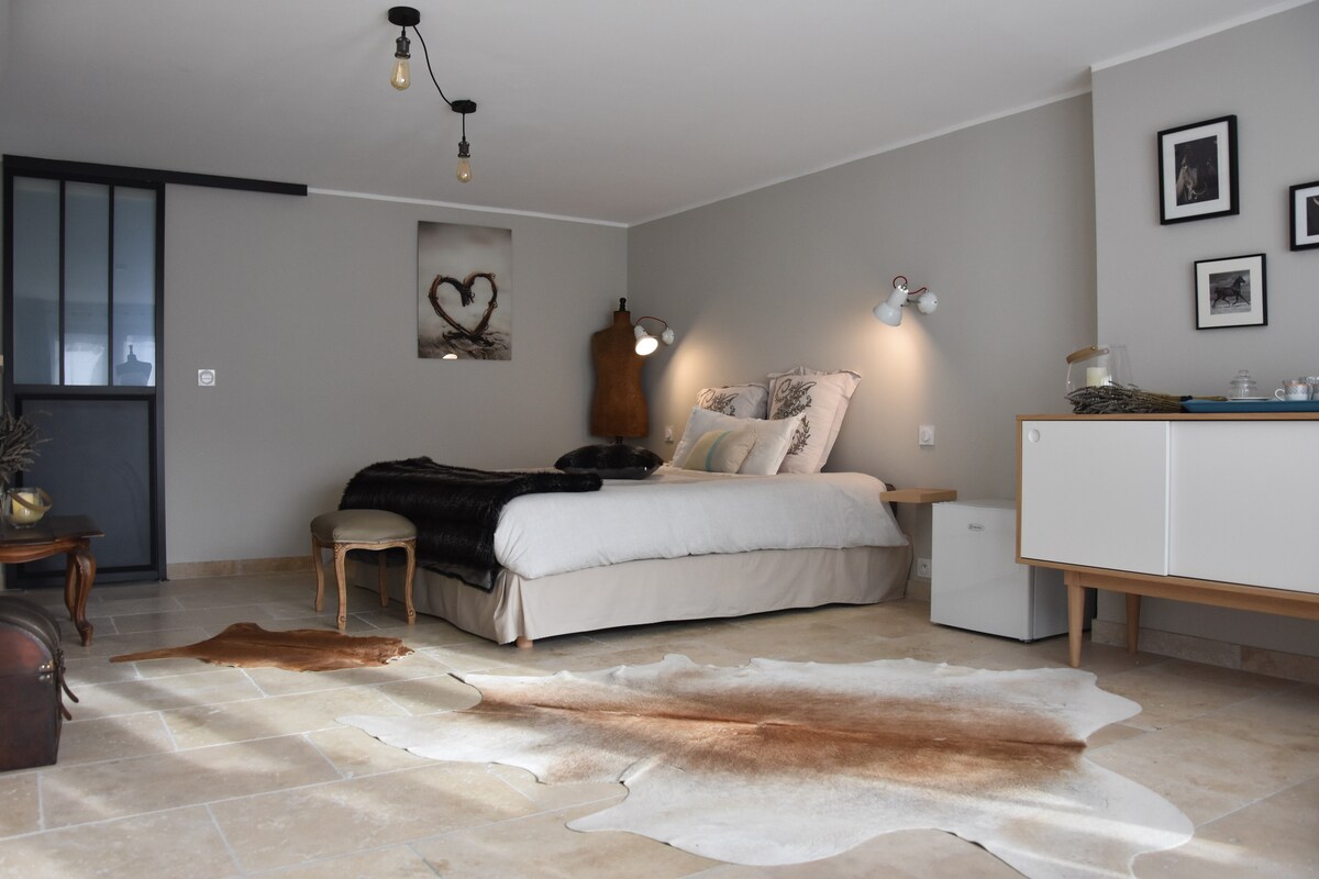 Vi ønsker deg velkommen i grønne og rolige omgivelser, på en 3000 kvm eiendom. Omgitt av frukthager i hjertet av det provencalske landskapet, midt i Alpilles. Du finner alle bekvemmelighetene til et privat rom og terrassen med "UTENDØRS" kjøkken. Ideell beliggenhet 20 minutter fra St. Rémy de Provence, Avignon og Aix, vil du ha mange sportsaktiviteter (fotturer, klatring...) eller kulturelle aktiviteter, for eksempel å besøke arkeologiske steder, museer
