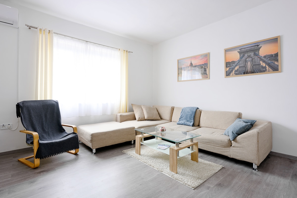 Very well located apartment house in the quiet garden city of Budapest. 3 rooms with 4 adult beds and an extra bed for 2 children or adults Well-equipped kitchen. In the yard, there is a garden swing for relaxing, as well as a garden grill. Our neighbor is sports facility with a swimming pool, a gym, etc. Liszt Ferenc International Airport is 7 minutes by car, 15 minutes by bus. The city center can be reached by public transport within a maximum of 25 minutes. The bus also runs at night.