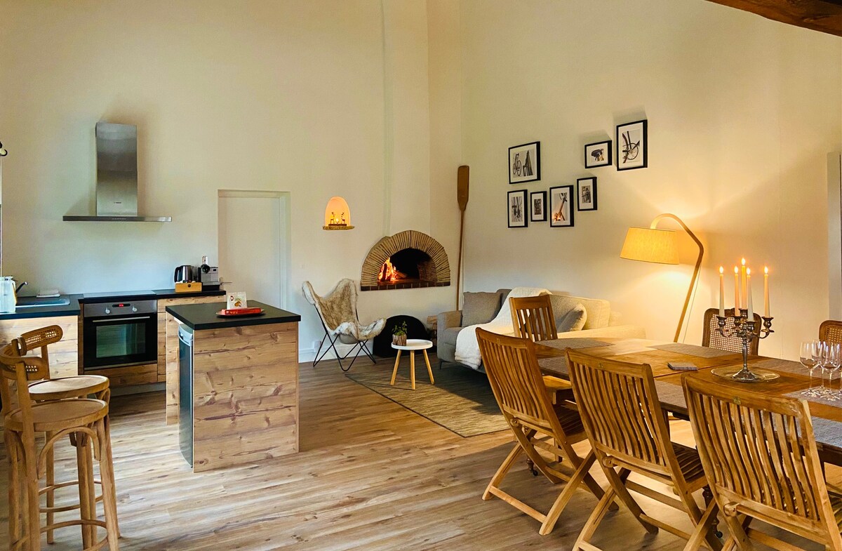 Oppdag denne atypiske og koselige boligen, en gammel låve som er restaurert med omhu. Nyt en unik innredning, inkludert møbler og barbotine, som skaper en varm og innbydende atmosfære. Dette fredelige tilfluktsstedet tilbyr en romslig plass med høy takhøyde, eksepsjonell komfort og et elegant badekar med løveføtter. Opplev en unik romantisk opplevelse i rolige og sjarmerende omgivelser, perfekt for å koble av og slappe av