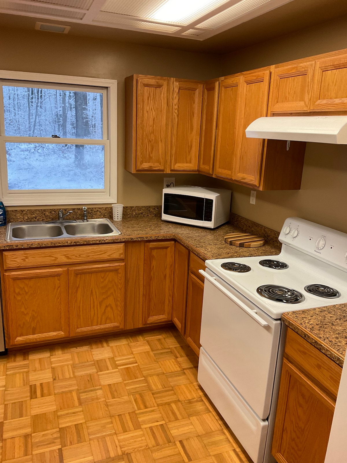 Du vil ha hele kjelleren - to soverom, bad, lite kjøkkenområde og stue - for deg selv. Vi er i skogkledde omgivelser et par kilometer fra byen. Du vil kunne nyte din egen terrasseinngang (utsikt over dammen) med tilgang til en bålplass. Vi er i nærheten av White Pine Trail. Vi tror du vil finne stedet fredelig og koselig. Det er en trapp til overetasjen, men den er avskjermet med gardin og dekket med skumplate for privatliv. Du vil ha hele etasjen og inngangen for deg selv!