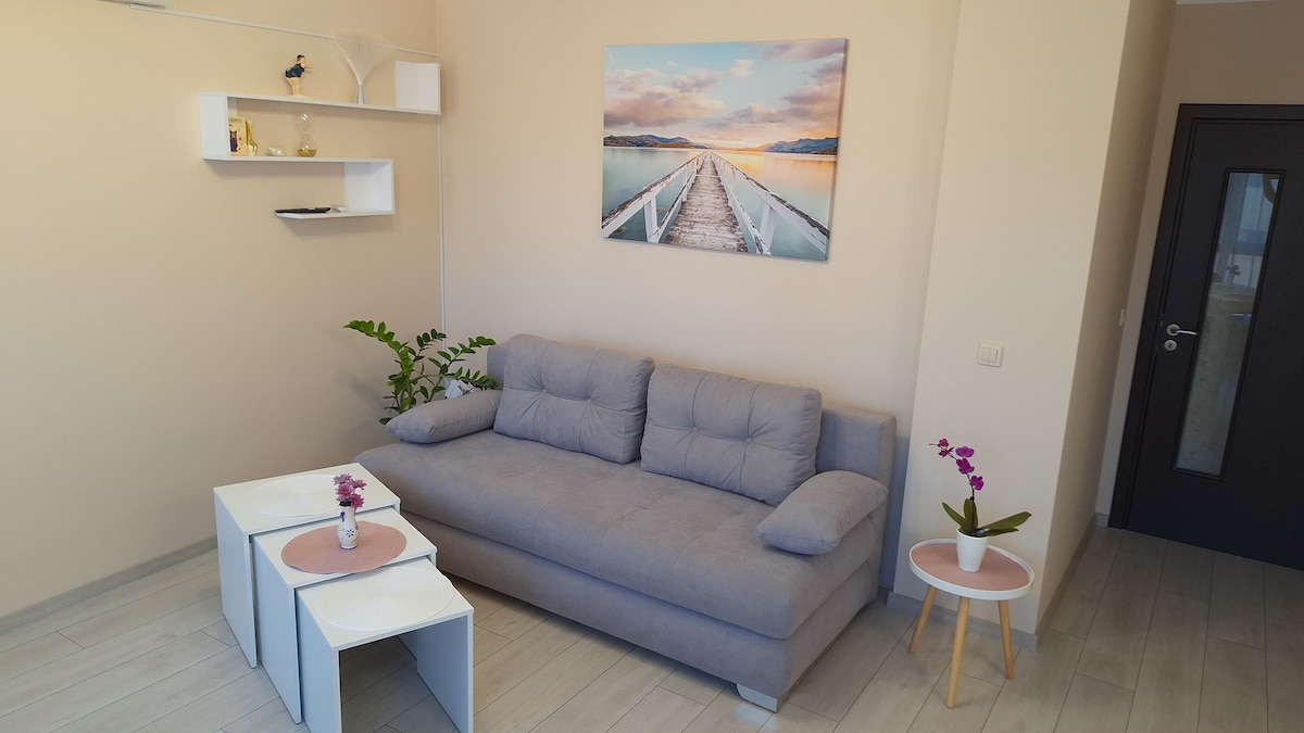 "Et hjem å glede seg over" For din komfort, kombinert med ro, eksotisme og koselig hjemlig sjarm, med et pust av sjø og strand, naturlig friskhet om morgenen med en kopp aromatisk kaffe og dynamikken i de vakre sommerkveldene delt med kjære og venner!🌴🌞🌺 Velkommen til Varna – vår sjøhovedstad, Chaika Resort, Kabakum, Argish Palace – et lukket eksotisk kompleks med døgnåpen sikkerhet og en parkeringsplass inkludert! Kabakum-stranden ligger 7–10 minutters gange unna, 600 meter. Det er restauranter, dagligvarebutikker og svømmebassenger i nærheten!